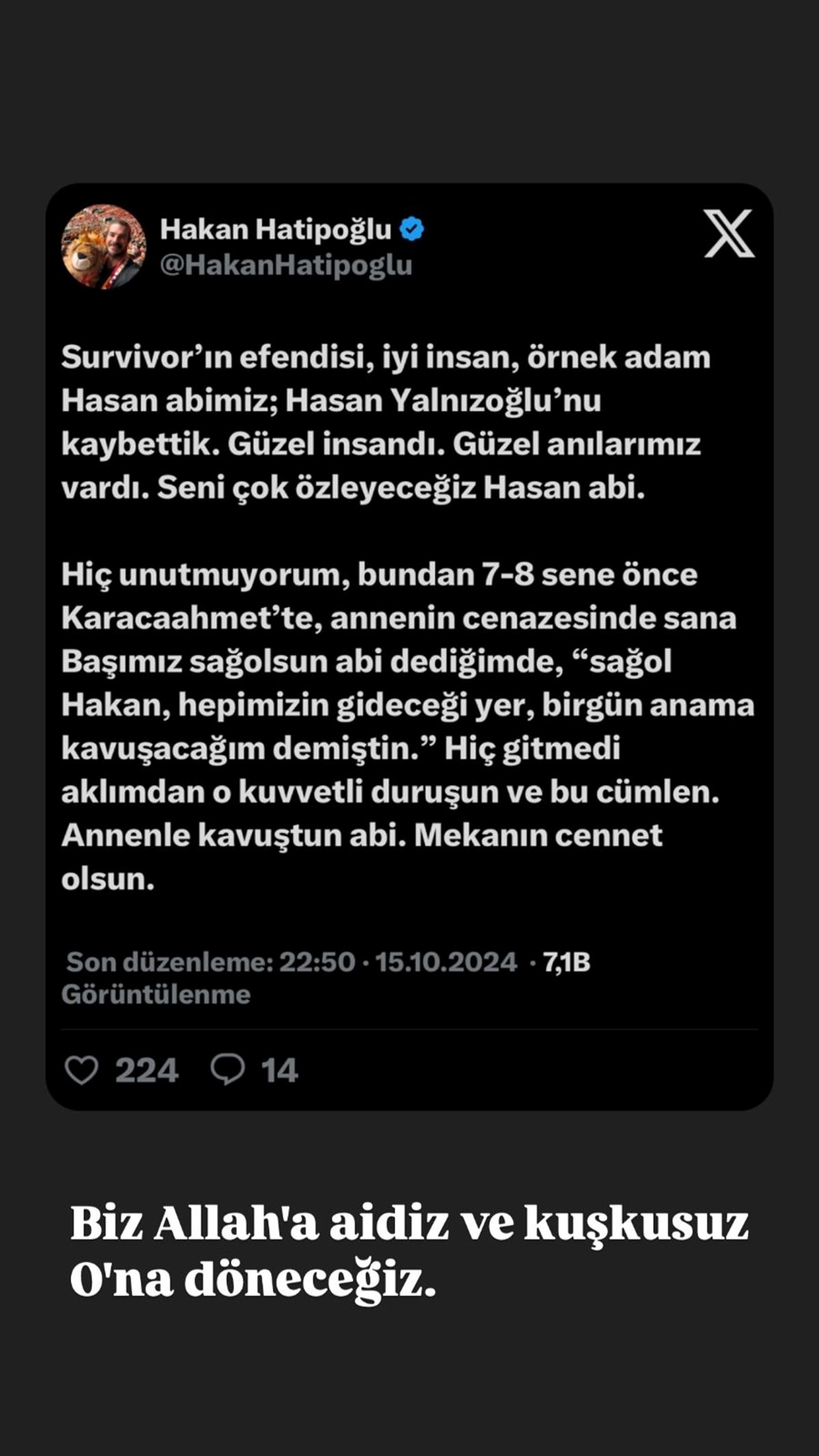 Survivor ile tanınan ünlü oyuncu ve dansçı Hasan Yalnızoğlu, 50 yaşında hayatını kaybetti. Yalnızoğlu'nun vefatının ardından ünlü isimler art arda başsağlığı mesajları yayınladı. İşte ünlü isimlerin Hasan Yalnızoğlu paylaşımları...Türkiye'nin tanınmış dans gruplarından Sultans of the Dance ve Anadolu Ateşi'nde baş dansçı olarak büyük başarılar kazanan Hasan Yalnızoğlu, 50 yaşında hayatını kaybetti. Ünlü isimler Hasan Yalnızoğlu'nun vefat haberinin ardından art arda başsağlığı mesajları yayınladı. İşte o paylaşımlar...ACUN ILICALI "Değerli arkadaşımız Hasan Yalnızoğlu’nu kaybetmenin derin üzüntüsünü yaşıyoruz. Kendisine Allah’tan rahmet, ailesine ve tüm sevenlerine başsağlığı diliyorum. Mekanı cennet olsun"TÜMAY ÖZOKUR "Şaka mısınız ya... Teker teker gidiyorsunuz. Çok sevdim lan seni. Sende beni çok. Adam." EZEL AKAY "Ah sevgili Hasan! İyi kalpli, vicdanlı ve yetenekli dostum, oyuncum, Hasan Yalnızoğlu, maalesef vefat etti! Sevenlerinin başı sağ olsun..."AHU YAĞTU "Melekti o her zaman. Işıklar içinde uyu, çok üzgünüm" DENİZ PULAŞ "Canım arkadaşım. Mekanın cennet olsun, hepimizin başı sağ olsun.. Çok mücadele verdin. Acıların dindi. Evladın bize emanet."BERK OKTAY "Abimiz oldun abi... Mekanın cennet olsun... Zaman iğrenç bir şey!" YEŞİM SALKIM "İyiler mi gider hep erken erken! Nur içinde yat."KUBAT "İnlettin be Hasan’ım fena inlettin bizi!Koca yürekli dostum benim, dünyanın en nazik insanı, karıncayı incitmeyen merhametli kardeşim benim… Ne kadar mutlu olmuştun bu türküleri söylerken ve programı kaydederken... “Benden bir hoş seda kalsın Kubat’ım.” demiştin… Bir yandan ağlayıp bir yandan da söylemiştik iştahlı iştahlı… Acılı ailenin ve tüm sevenlerinin başı sağolsun. Mekanın cennet ve gönüller olsun Hasan'ım"HAKAN HATİPOĞLU "Survivor’ın efendisi, iyi insan, örnek adam Hasan abimiz; Hasan Yalnızoğlu’nu kaybettik. Güzel insandı. Güzel anılarımız vardı. Seni çok özleyeceğiz Hasan abi. Hiç unutmuyorum, bundan 7-8 sene önce Karacaahmet’te, annenin cenazesinde sana 'Başımız sağ olsun abi' dediğimde, 'Sağ ol Hakan, hepimizin gideceği yer, birgün anama kavuşacağım demiştin' Hiç gitmedi aklımdan o kuvvetli duruşun ve bu cümlen. Annenle kavuştun abi. Mekanın cennet olsun."NİHAT ALTIKAYA "Mekanın cennet olsun güzel kalpli insan..." AVATAR ATAKAN "Çok sevdiğim güzel insan Hasan Yalnızoğlu’nun vefatını üzüntüyle öğrendim. Mekanın cennet olsun güzel insan. Ailesine ve sevenlerine başsağlığı dilerim."20 Ekim 1974 tarihinde İstanbul'da dünyaya gelen Hasan Yalnızoğlu, Marmara Üniversitesi Beden Eğitimi ve Spor Yüksek Okulu ve Marmara Üniversitesi Yöneticilik mezunudur. 1997 yılında Best Model of Turkey yarışmasında ikinci olan Yalnızoğlu, Türkiye'nin tanınmış dans gruplarından Sultans of the Dance ve Anadolu Ateşi'nde baş dansçı olarak yer aldı. Survivor Ünlüler - Gönüllüler yarışmasında ikinci olan Yalnızoğlu, 2015 yılında, Acun Ilıcalı'nın TV8 ekranlarında düzenlediği Survivor All Star yarışmasında gönüllüler takımında yer aldı ve yarışmayı 5. olarak tamamladı. Hasan Yalnızoğlu, 2002 yapımı "Karaoğlan" ile başladığı oyunculuk kariyerinde ise 18 yapımda rol aldı. 2007 yılından bu yana dansçı Tatiana Ruichiana ile mutlu bir evliliği olan Yalnızoğlu'nun 7 yaşında bir kızı bulunuyor.