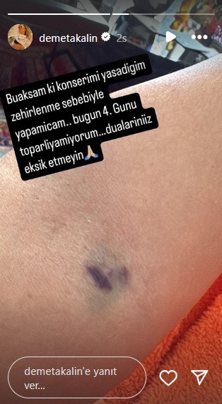Kolundaki morluğu takipçileriyle paylaşan Demet Akalın, "Bu akşamki konserimi zehirlenme sebebiyle yapamayacağım. Bugün 4. günü toparlayamıyorum. Dualarınızı eksik etmeyin" ifadelerini kullandı.