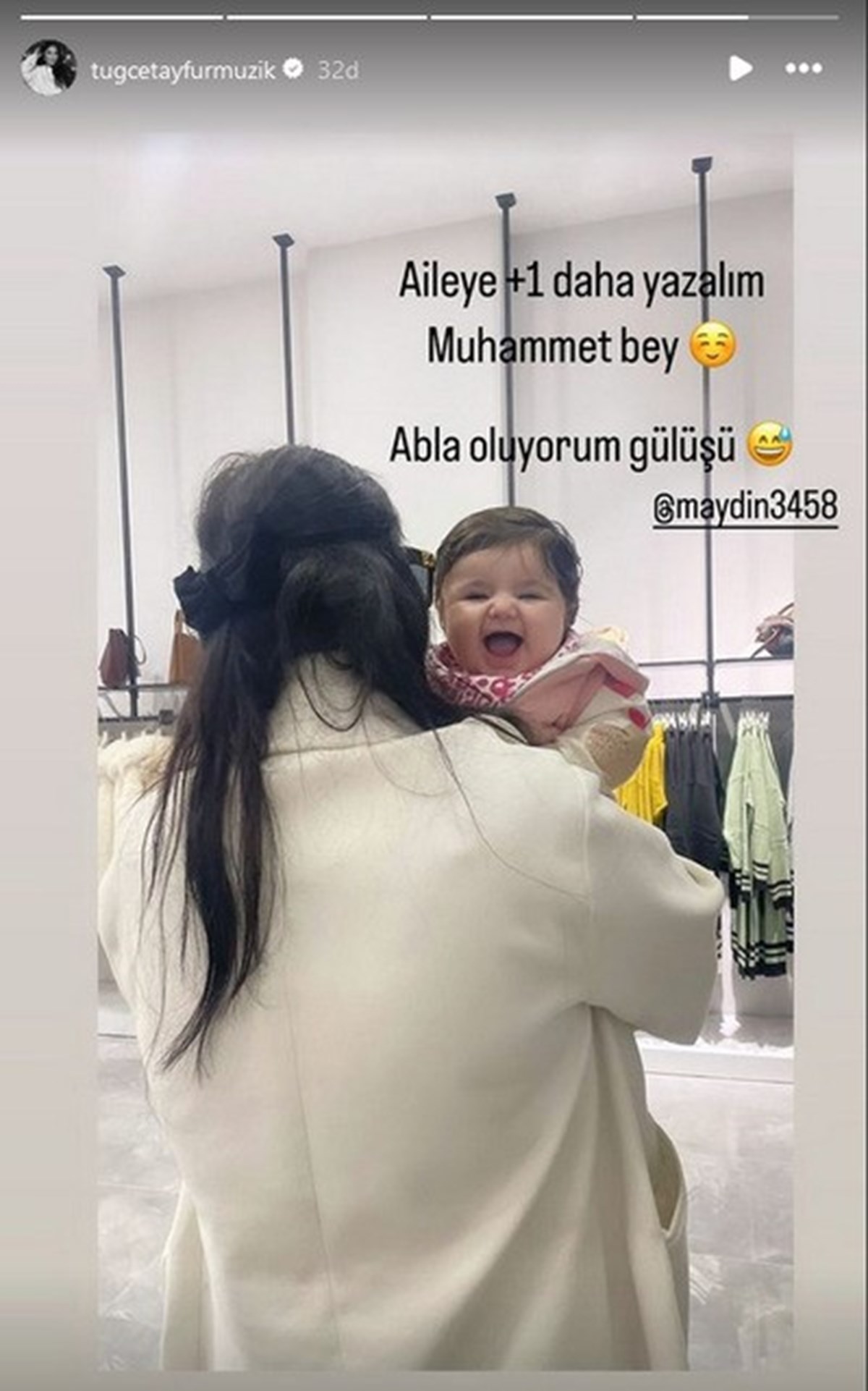 Tuğçe Tayfur Aydın, kızıyla yer aldığı fotoğrafı paylaştı ve "Aileye +1 daha yazalım Muhammed bey. Abla oluyorum gülüşü" notunu düştü. Öte yandan Tuğçe Tayfur'un 2019 yılında boşandığı Taner Şafak ile evliliğinden Taner Efe adında bir oğlu bulunuyor.