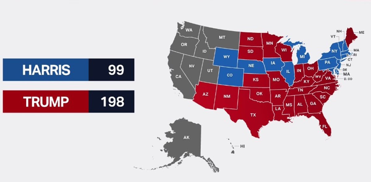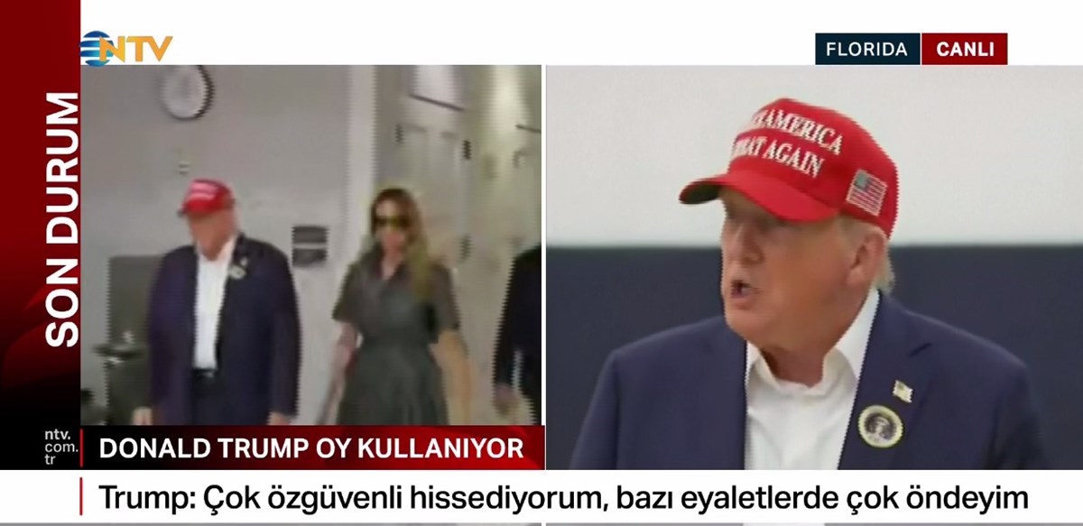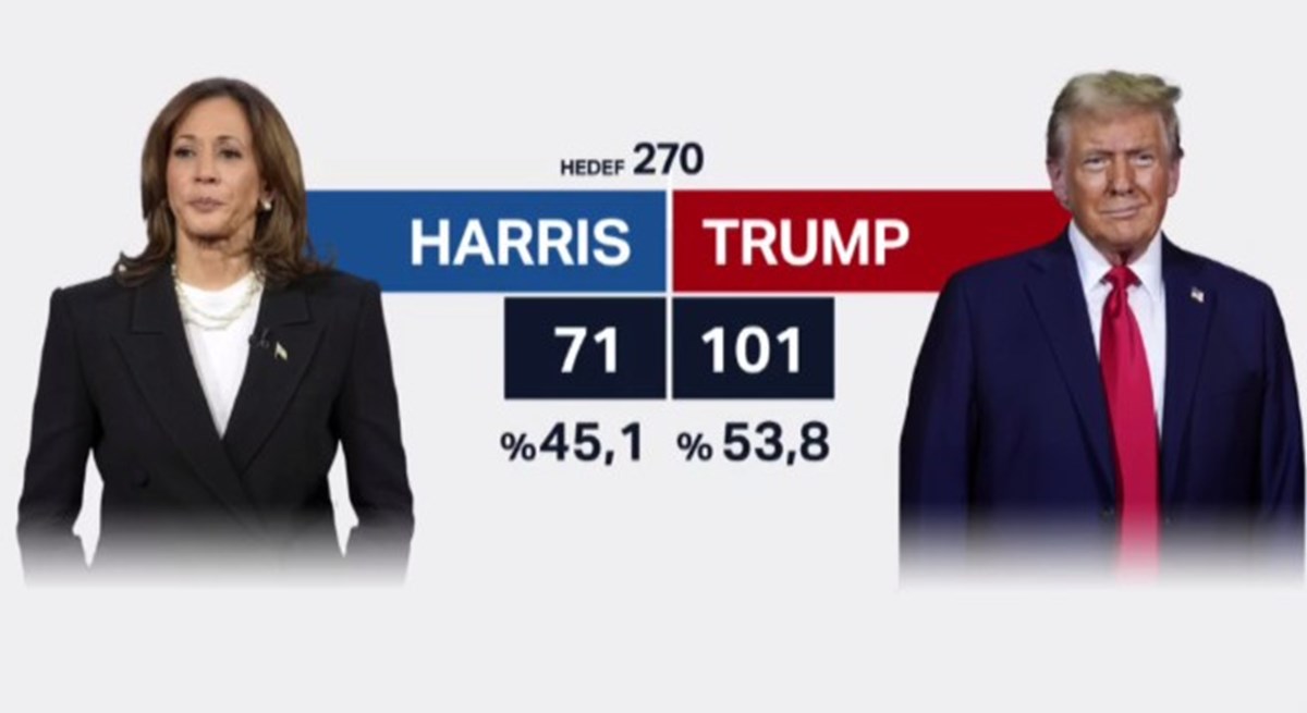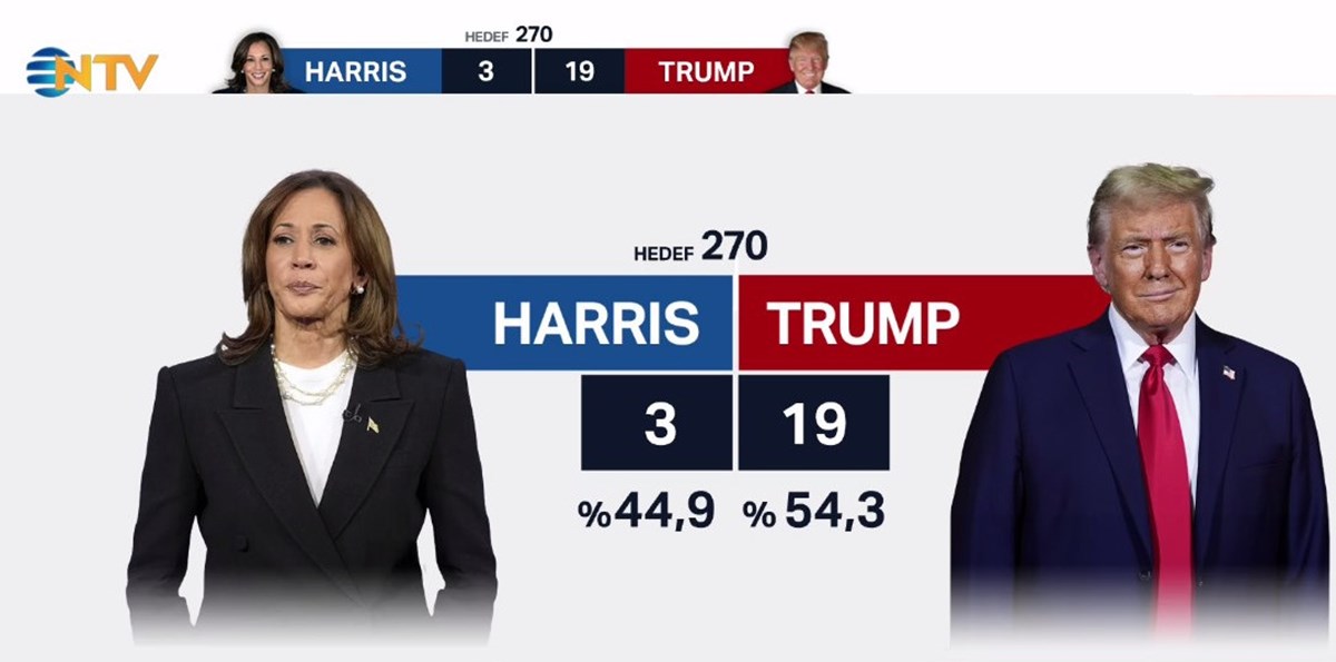 Kamala Harris ve Donald Trump’ın yarıştığı ABD başkanlık seçimlerinde 35 eyalette oyların sayımı sürerken Trump, Florida'da yaptığı konuşmada zaferini ilan etti. Oyların yaklaşık yüzde 87'sini sayılırken, Trump 51,2 oran ile yüzde 47,4 oy alan Harris'e karşı önde. Trump, başkanlık için gereken 270 delege sayısını aşarak, 277 delege elde etti. Harris ise 224'te kaldı. 5 Kasım 2024 ABD seçimlerinde son durum ne? Demokrat Parti adayı Kamala Harris mi önde yoksa Cumhuriyetçi Parti adayı Donald Trump mı? 2024 ABD başkanlık seçimlerinde Kamala Harris ve Donald Trump'ın ne kadar oy alacağını tüm dünya merak ediyor. ABD seçimlerinde adayların anlık oy oranları nedir, seçimi kim kazanacak? Oy sayma işlemlerinin başlamasıyla eyalet eyalet seçim sonuçları ve ABD seçim haritası açıklanıyor. ABD seçim sonuçları 2024 canlı ve son dakika olarak NTV Haber'de! ABD seçim sonuçları canlı ve anlık olarak izle...