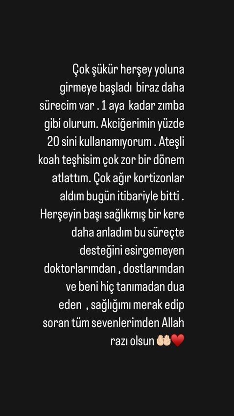 Uras, "Çok şükür her şey yoluna girmeye başladı. Biraz daha sürecim var. Bir aya kadar zımba gibi olurum. Akciğerimin yüzde 20'sini kullanamıyorum. Ateşli KOAH teşhisi konuldu. Çok zor bir dönem atlattım. Çok ağır kortizonlar aldım, bugün itibariyle bitti. Her şeyin başı sağlıkmış bir kere daha anladım" ifadelerini kullandı.