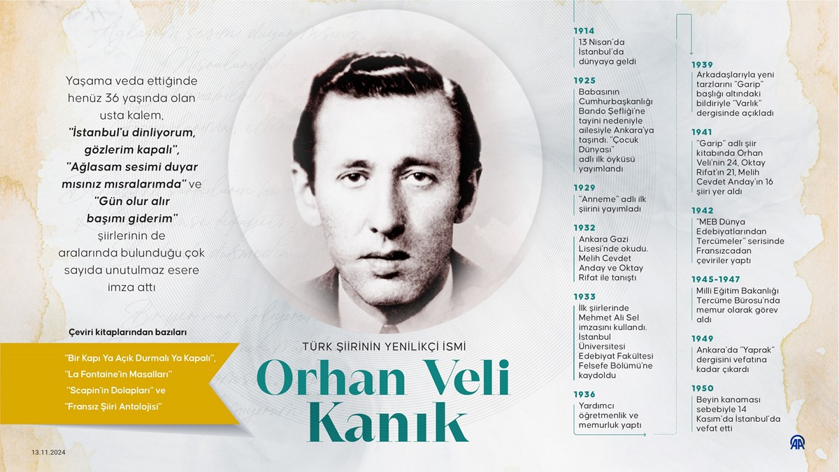 "İstanbul'u Dinliyorum", "Güzel Havalar", "Bir Garip Orhan Veli" ve "Anlatamıyorum" şiirlerinin de aralarında bulunduğu çok sayıda unutulmaz eseri miras bırakan usta şair, en özgün ve yenilikçi şairlerden biri olarak Türk edebiyatına adını kazıdı. Kanık, Mızıka-yı Hümayun'da klarnist Mehmet Veli Bey ile Fatma Nigar Hanım'ın ilk çocuğu olarak, 13 Nisan 1914'te Beykoz'a bağlı Yalıköy'deki bir konakta doğdu. Asıl adı "Ahmet Orhan" olan şairin ailesi, Soyadı Kanunu'nun ardından "Kanık" soyadını aldı. Kanundan önce, babasının adındaki "Veli"yi sahiplenen Kanık, edebiyat çevrelerinde "Orhan Veli" olarak tanındı. HALİFE ABDÜLMECİD'İN SARAYDA DÜZENLEDİĞİ TÖRENDE SÜNNET EDİLDİ