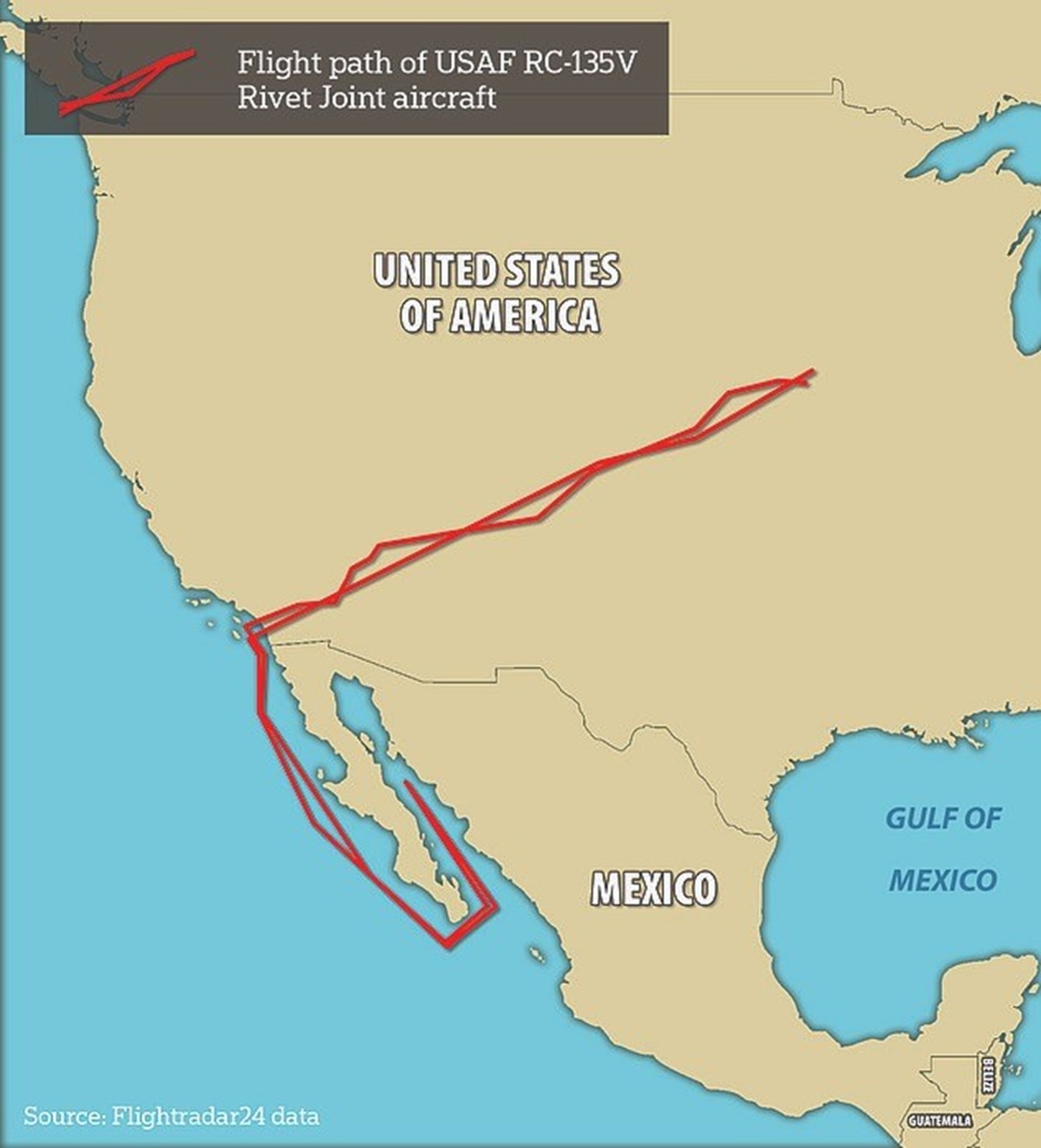 ABD Hava Kuvvetleri’ne ait RC-135 Rivet Joint casus uçağı, Meksika’daki Kaliforniya Körfezi üzerinde gizemli bir görev için uçtu. Nebraska’daki Offutt Hava Üssü’nden havalanan uçak, Baja California kıyıları boyunca uçup üssüne döndü. Bölge, Meksika’nın en büyük ve en kötü şöhretli uyuşturucu kartellerinden biri olan Sinaloa Karteli’nin etkisi altındaki bir alan olarak bilinirken, uçuş amacının istihbarat toplamak olduğu düşünülüyor.