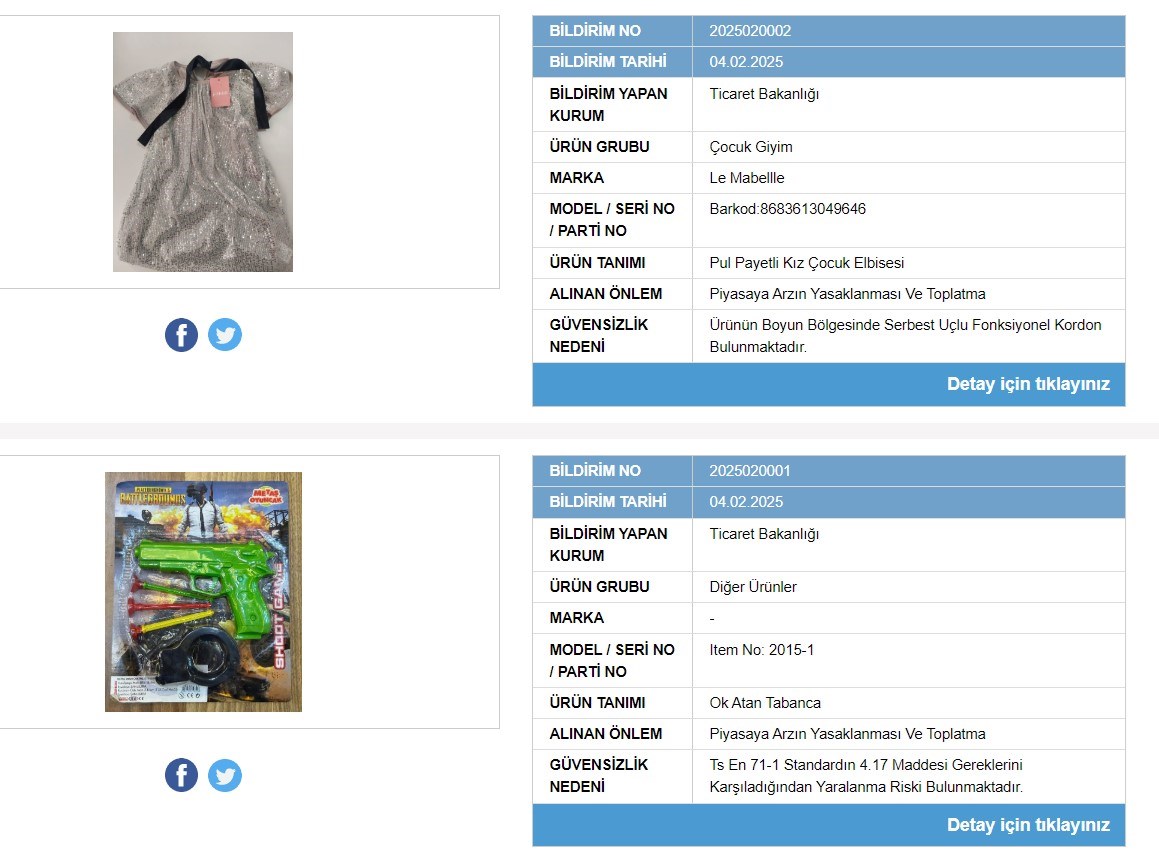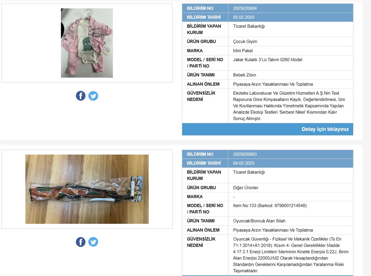 Ticaret Bakanlığı, çocuklara yönelik iki giyim eşyası ve iki oyuncak için toplatılma kararı verdi. Güvensiz Ürün Bilgi Sistemi üzerinden ilan edilen ürünlerin kullanımı yasaklanarak, toplatılmasına karar verildi.Ticaret Bakanlığı, çocuk sağlığı açısından güvenli olmayan dört ürünü "Güvensiz Ürün Bilgi Sistemi" üzerinden ilan ederek piyasadan toplatılmasına karar verdi. Bakanlık, bir adet çocuk giyim ürünü ve iki adet oyuncağın sağlıksız olduğunu tespit etti. İlgili ürünler hakkında yasaklanması kararı alınırken, piyasadan toplatılmalarına karar verildi. İşte piyasaya arzı durdurulup toplatılmasına karar verilen o ürünler: