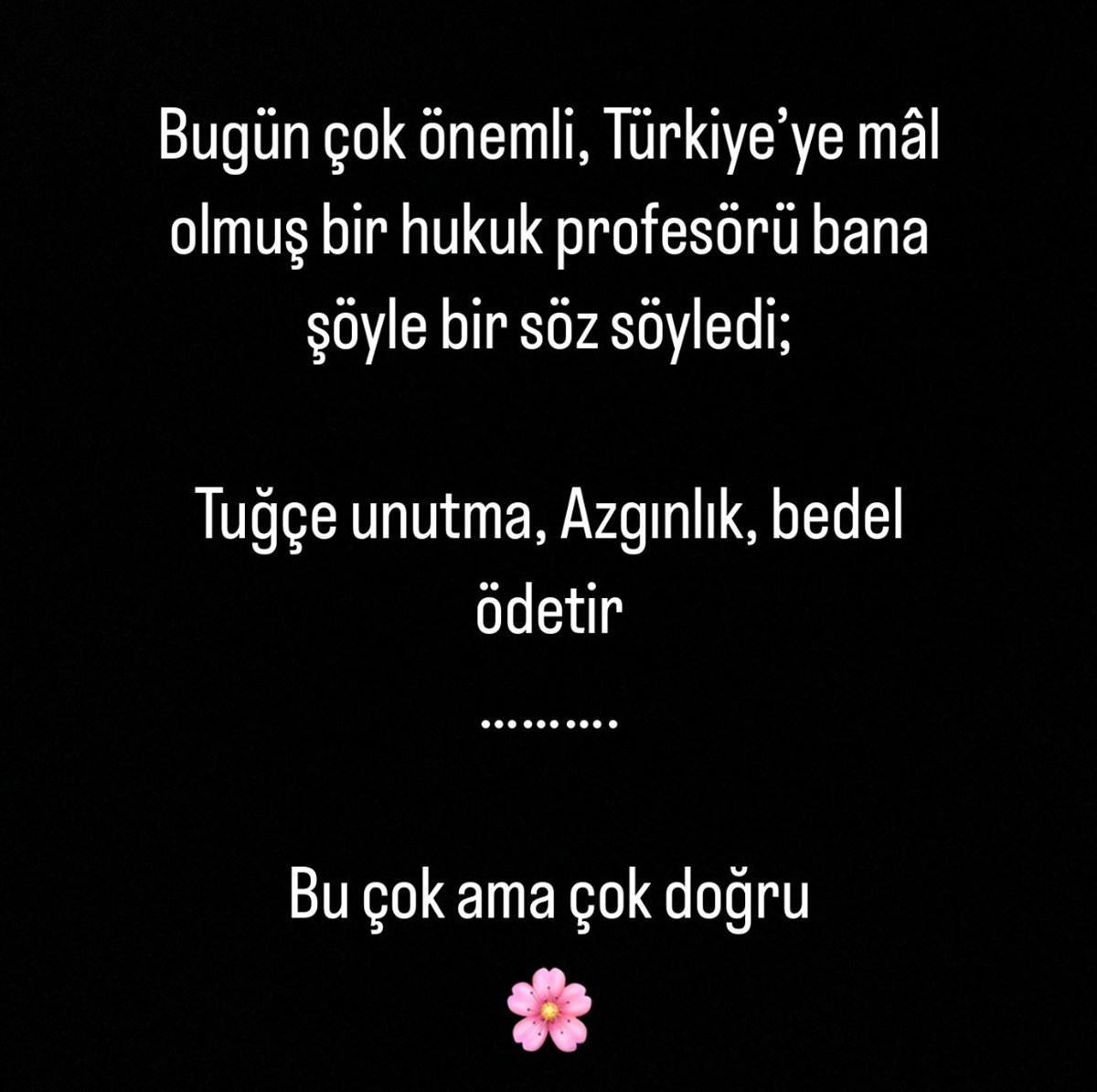 Tuğçe Tayfur, "Bugün çok önemli, Türkiye'ye mâl olmuş bir hukuk profesörü bana şöyle biz söz söyledi; Tuğçe unutma, azgınlık bedel ödetir. Bu çok ama çok doğru..." ifadelerini kullandı.