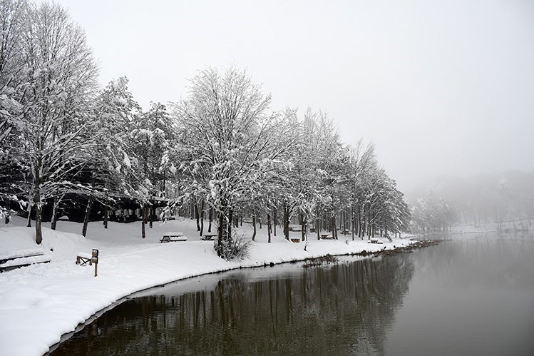 Düzce'nin Kaynaşlı ilçesinde kar yağışının ardından beyaza bürünen Korugöl Tabiat Parkı'nda kartpostallık manzaralar oluştu.