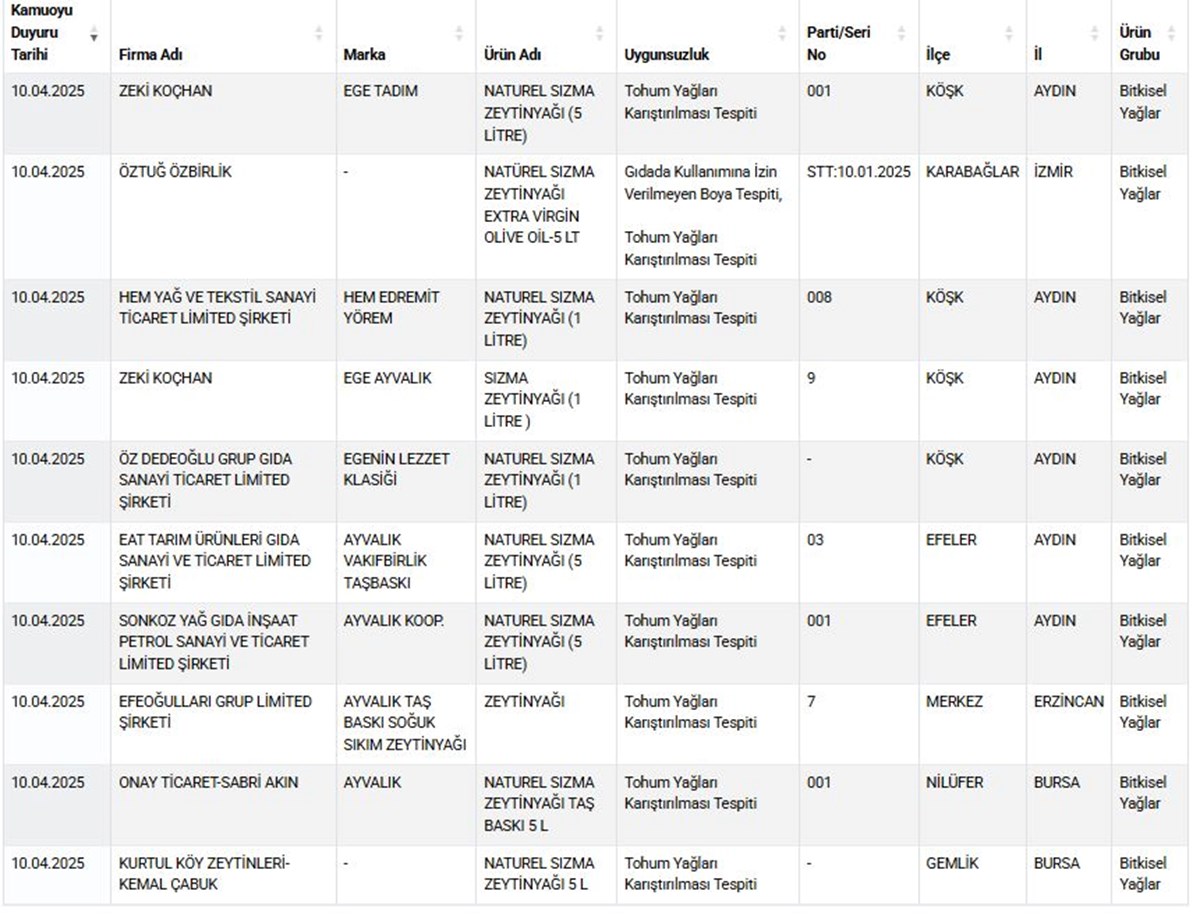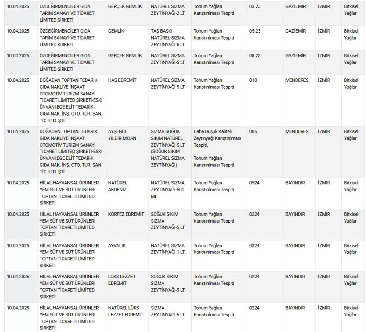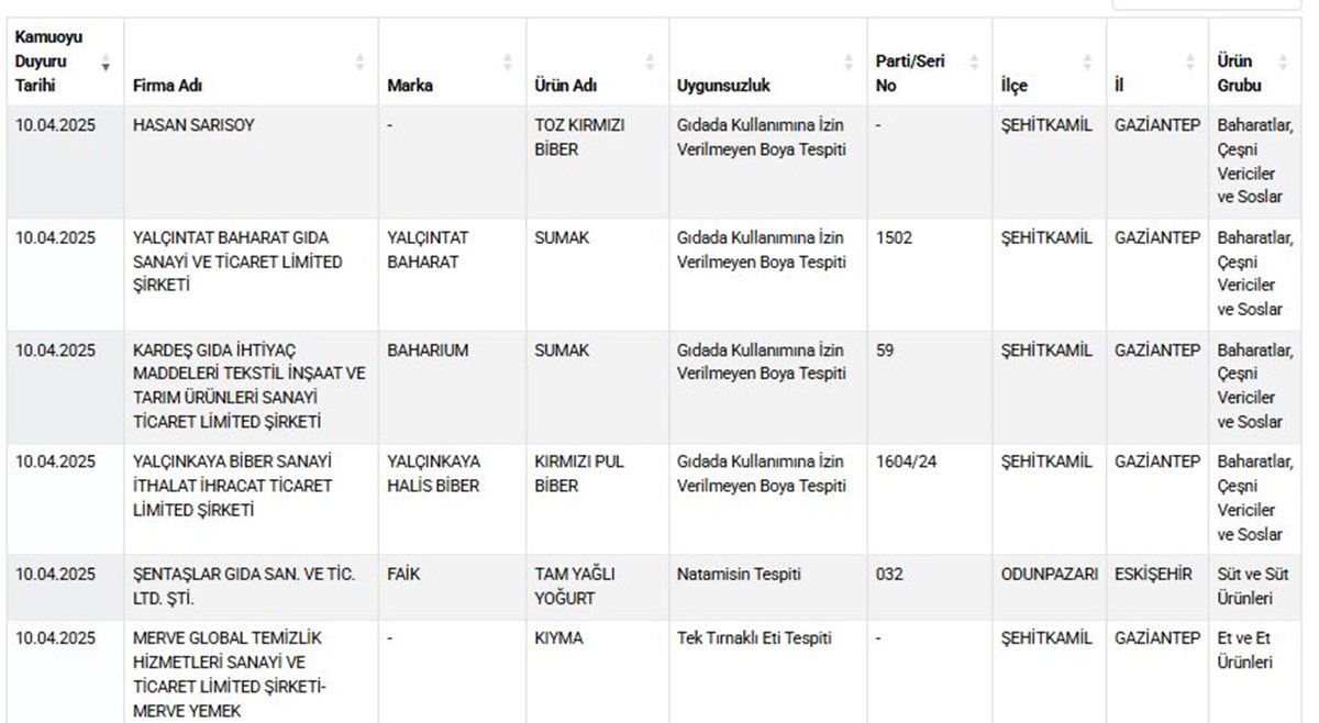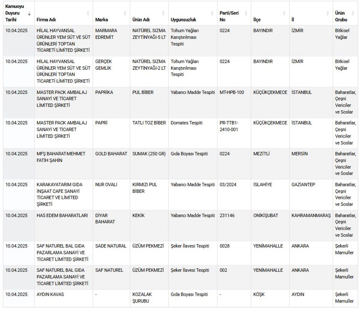 Sağlığı tehlikeye düşürecek gıdalar listesi güncellendi. Yapılan denetimlerde kıymadan köfteye, zeytinyağından peynire 49 üründe sahtecilik tespit edildi.Tarım ve Orman Bakanlığı, taklit-tağşiş yapılan ve sağlığı tehlikeye düşürebilecek gıdalar listesini güncelledi, 49 üründe sahtecilik tespit etti. Yapılan denetimlerde kişilerin hayatını ve sağlığını tehlikeye düşürecek şekilde bozulmuş ve değiştirilmiş ürün sayısı 5 artarak 209'a yükseldi.Taklit ve tağşiş yapılan gıdalar listesine 44 yeni ürün eklendi. Yapılan denetimlerde taklit veya tağşiş yapıldığı kesinleşmiş ürün sayısı bin 250 oldu.Sağlığı tehlikeye düşürecek gıdalar listesinde yer alan Gaziantep'te faaliyet gösteren 3 baharat firmasının kullanımı yasak olan boyayı ürünlerinde kullandıkları tespit edildi. Eskişehir'de yoğurt üretimi yapan firmanın ürünlerinde ise natamisin tespit edildi. Gaziantep'te faaliyet gösteren Merve Yemek firmasının kıymasında da tek tırnaklı eti tespit edildi.Yapılan denetimlerde 44 üründe sahtecilik tespit edildi. Zeytinyağlarında tohum yağları, baharatlarda yabancı madde ve kasap köftesinde deri ve sakatat ürün kullanan firmalar ifşa edildi.