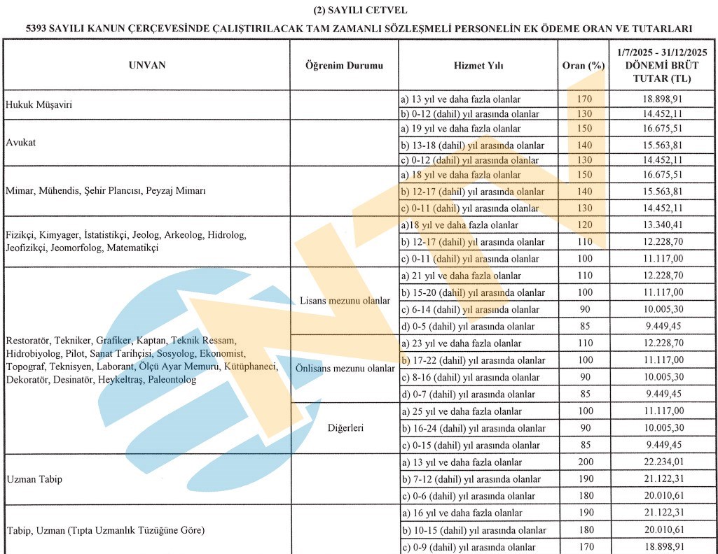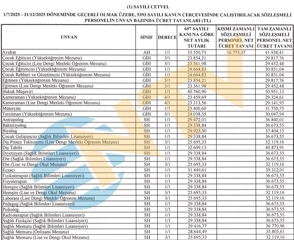 Kamuda görev alan sözleşmeli personellerin ücret tavanları kesinleşti. Yüzde 15.57 oranında zam alan sözleşmeli personellerin yeni alacakları maaşlar da belirlenmiş oldu. Ayrıca sözleşmeleri bu yıl sonu bitecek olan personeller için 15 Aralık 2025 - 31 Aralık 2025 tarihleri arasındaki 17 günlük süre için 15 Aralık 2025 tarihi itibarıyla geçerli olan aylık net sözleşme ücretinin 17/31'i kadar, ek ödemenin de 17/31'i kadar ödeme yapılacak. İşte ünvanlara göre sözleşmeli personellerin tavan ücretleri