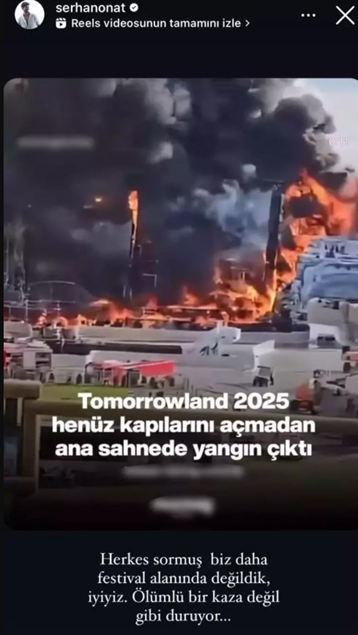 Avrupa'nın en büyük müzik etkinliklerinden olan Tomorrowland'in ana sahnesinde yangın çıktı. Yangın sonrası sahne küle dönerken; festivale giden oyuncu Serhan Onat'tan açıklama geldi.