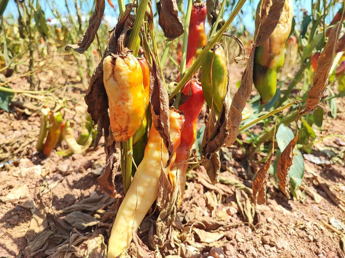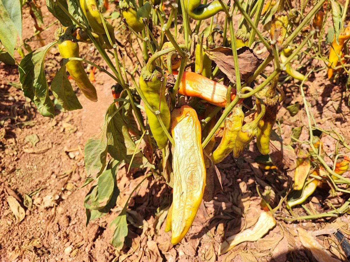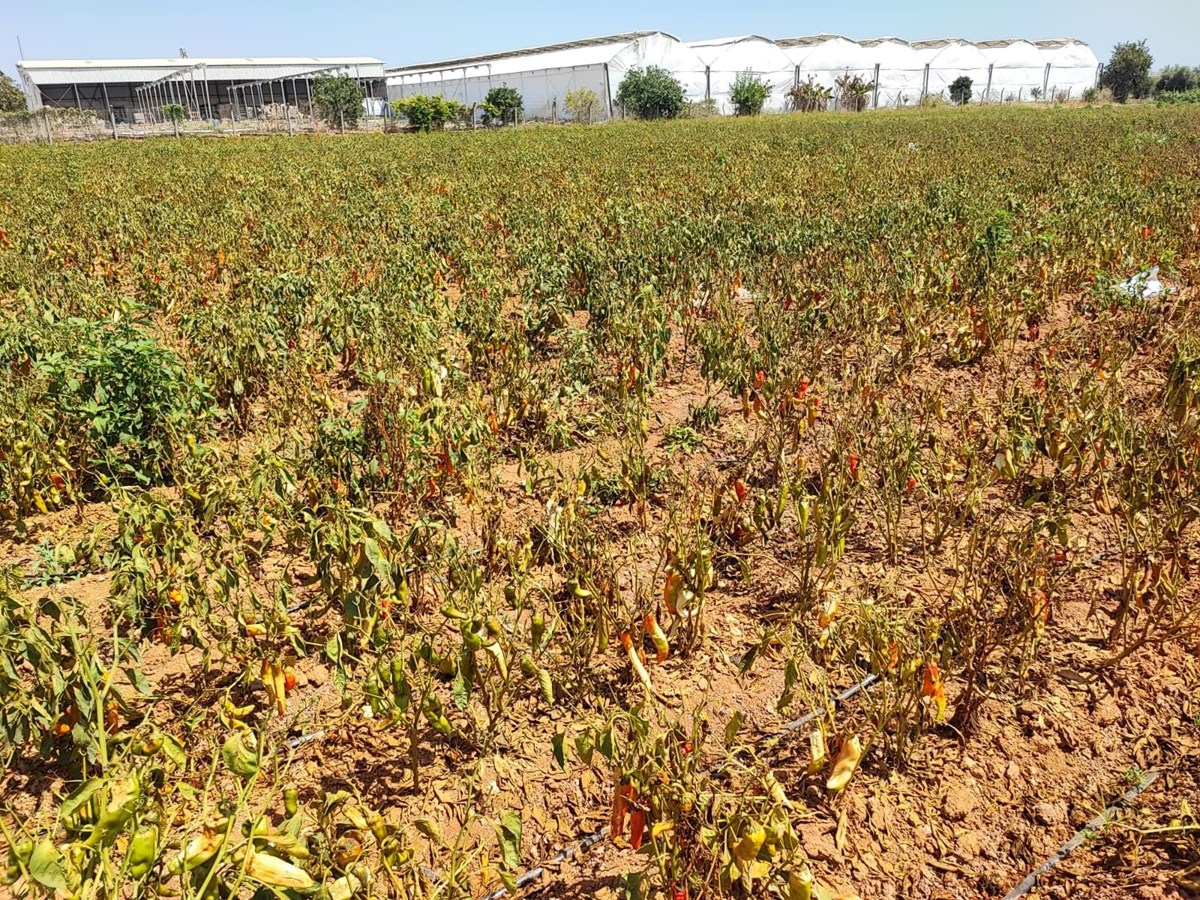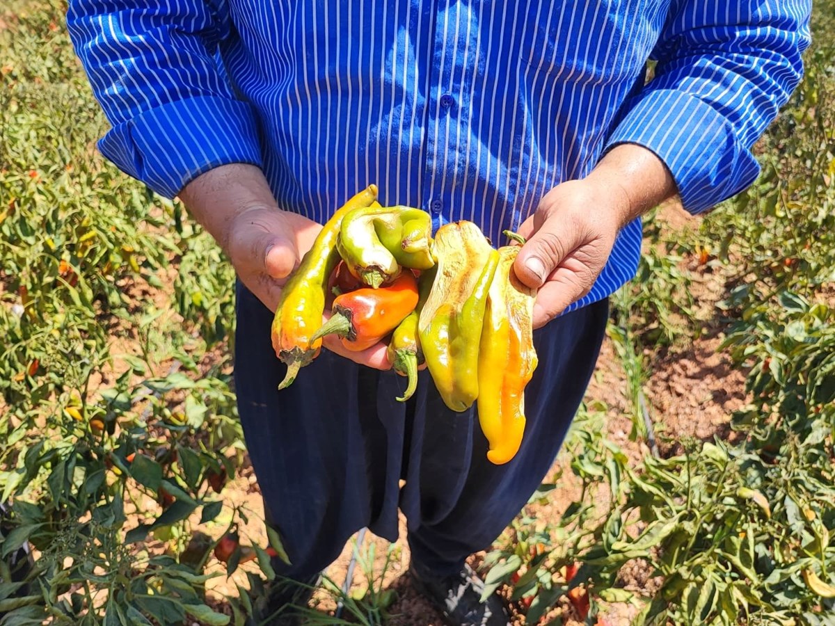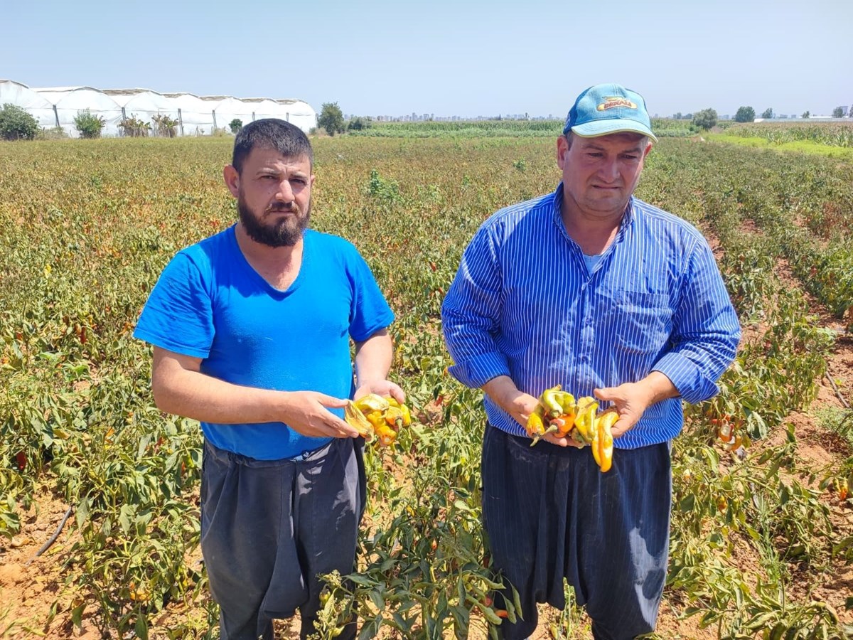 Türkiye'nin en sıcak illerinden Adana'da, tarlalarda yetişen kırmızı kapya biberler, aşırı sıcak nedeniyle zarar gördü. Yüzde 30 seviyesinde verim kaybı yaşandığı belirtilen biberin, buna rağmen bahçede fiyatının 10-12 TL civarında olduğu öğrenildi.