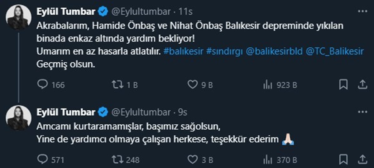 Resmi X hesabından deprem sonrasında paylaşımda bulunan Eylül Tumbar, "Akrabalarım, Hamide Önbaş ve Nihat Önbaş Balıkesir depreminde yıkılan binada enkaz altında yardım bekliyor! Umarım en az hasarla atlatılır. Geçmiş olsun." demişti. Depremden yaklaşık 2 saat sonra acı haberi duyuran Eylül Tumbar, "Amcamı kurtaramamışlar, başımız sağolsun, Yine de yardımcı olmaya çalışan herkese, teşekkür ederim." dedi.