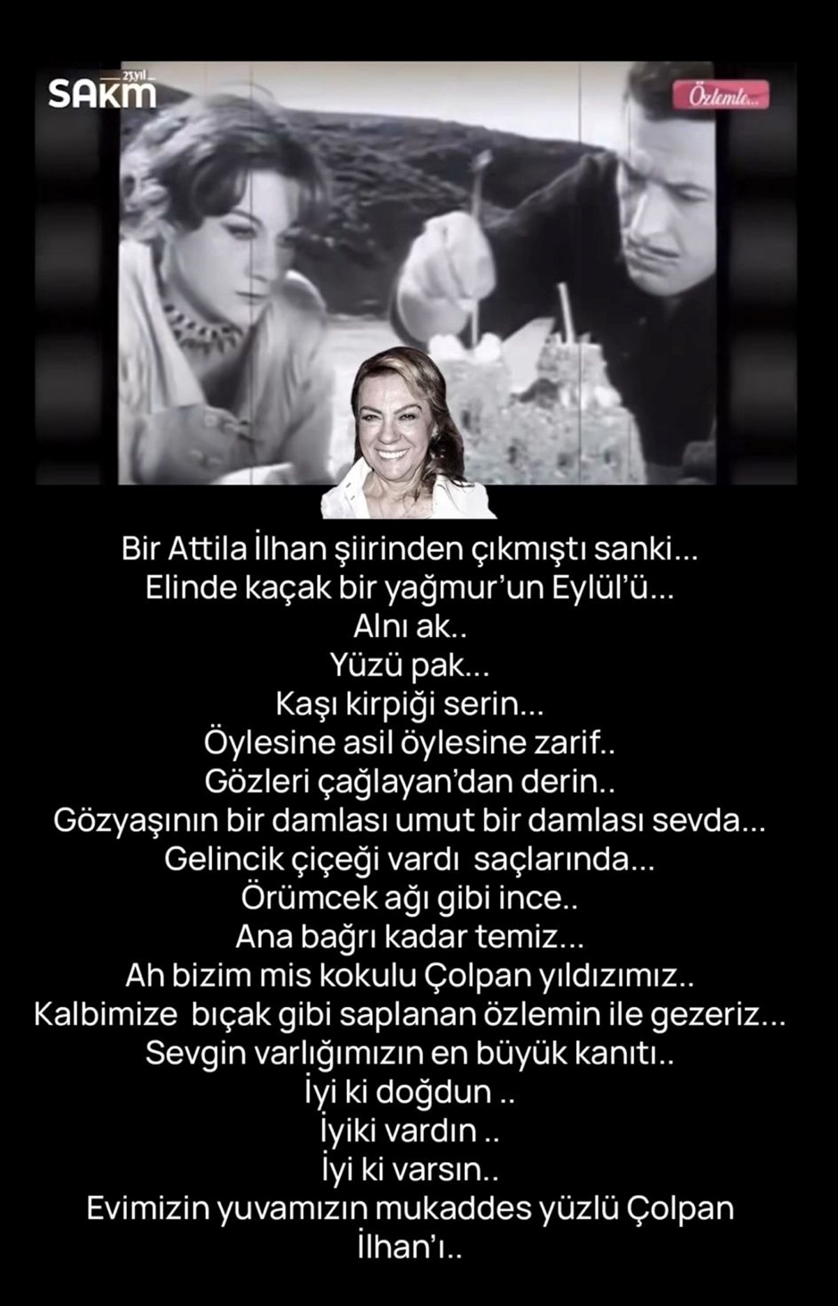 Ünlü oyuncu Kerem Alışık, 2014'te hayatını kaybeden annesi Çolpan İlhan'ı doğum gününde duygusal bir paylaşımla andı.Yeşilçam'ın usta oyuncusu Çolpan İlhan, 25 Temmuz 2014'te geçirdiği kalp krizi sonucu 78 yaşında hayatını kaybetti.Hayatta olsaydı bugün 89 yaşına basacak olan Çolpan İlhan'ın kendisi gibi oyuncu olan oğlu Kerem Alışık, annesini doğum gününde duygusal bir paylaşımla andı.Kerem Alışık, annesinin görüntülerinin yer aldığı videoyu şu sözlerle paylaştı: "Bir Attila İlhan şiirinden çıkmıştı sanki... Elinde kaçak bir yağmur'un Eylül'ü... Alnı ak, yüzü pak., kaşı kirpiği serin... Öylesine asil öylesine zarif. Gözleri çağlayan'dan derin. Gözyaşının bir damlası umut, bir damlası sevda. Gelincik çiçeği vardı saçlarında. Örümcek ağı gibi ince. Ana bağrı kadar temiz. Ah bizim mis kokulu Çolpan yıldızımız. Kalbimize bıçak gibi saplanan özlemin ile gezeriz. Sevgin varlığımızın en büyük kanıtı. İyi ki doğdun. İyi ki vardın, iyi ki varsın. Evimizin yuvamızın mukaddes yüzlü Çolpan İlhan'ı."Kerem Alışık'ın Sibel Turnagöl ile evliliğinden dünyaya gelen oğlu Sadri Alışık ise babaannesinin doğum gününü "İyi ki doğdun Çolpan Yıldızı" sözleriyle kutladı.Yeşilçam filmlerinin usta oyuncusu Çolpan İlhan, oynadığı sinema filmleriyle ve "Tatlı Hayat" dizisindeki "Feraye" rolüyle hatırlanıyor. Ressam ve tiyatro eğitmeni de olan İlhan, Muharrem Bedrettin İlhan ile Perihan İlhan'ın kızı olarak 8 Ağustos 1936'da İzmir'de dünyaya geldi.Eşi Sadri Alışık 1995'te hayatını kaybettikten sonra 1997'de Sadri Alışık Tiyatrosu'nu açan İlhan, oğlu Kerem Alışık ile birlikte kurduğu Sadri Alışık Kültür Merkezi'nde sanatçı gençlere destek oldu.Çolpan İlhan, 1998'de "Devlet Sanatçısı" unvanını aldı. Tatlı Hayat dizisinde oynadığı Feraye rolüyle 2001'de televizyon izleyicisinin beğenisini kazanan oyuncu, 25 Temmuz 2014'te hayatını kaybetti.