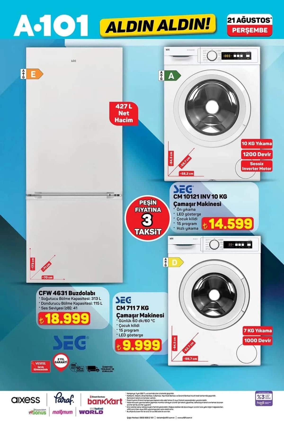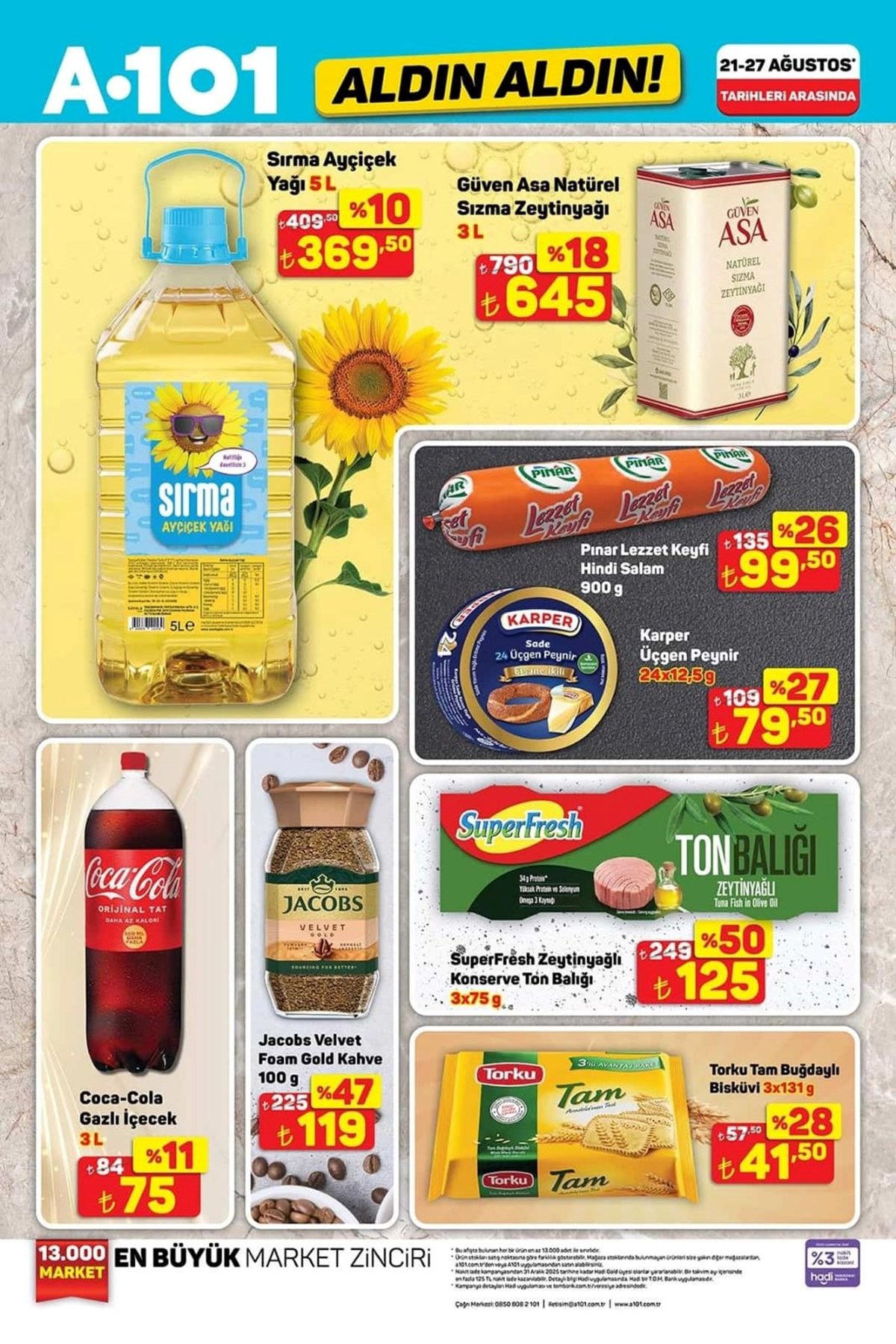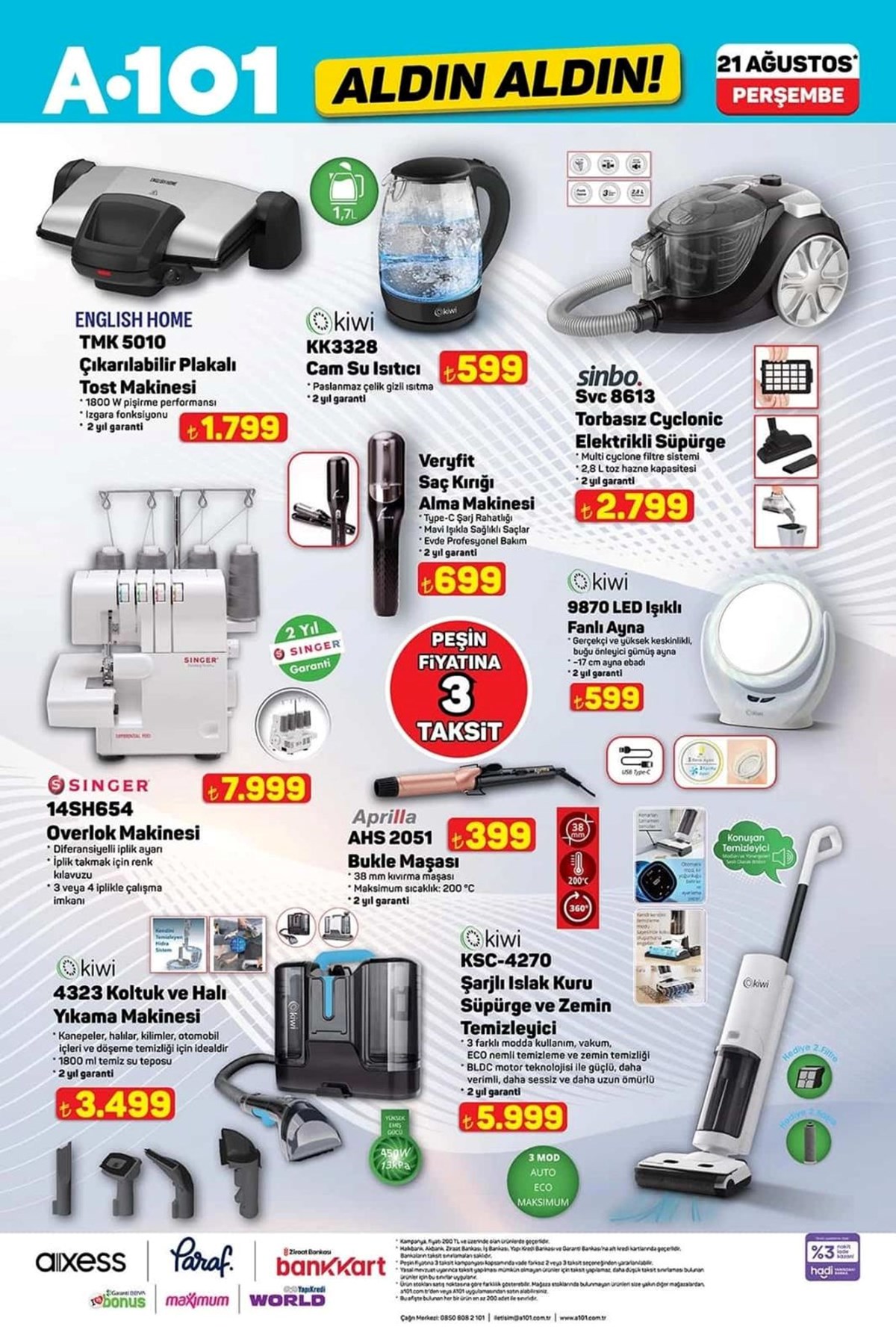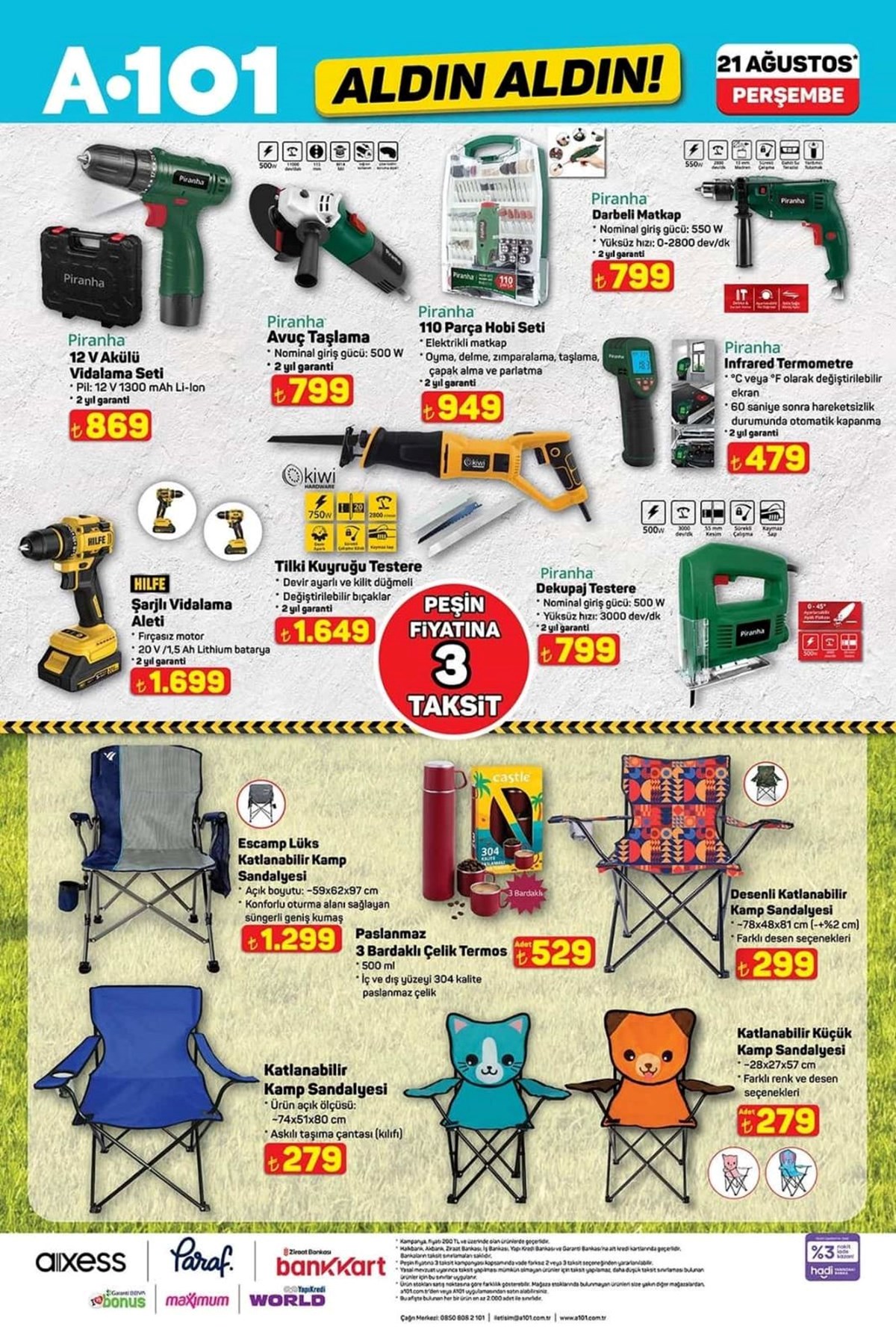 A101 21 Ağustos aktüel kataloğu ve fiyat listesi yayımlandı. A101’de haftanın kampanyalı ürünleri arasında beyaz eşyadan, televizyona, dizüstü bilgisayardan, elektronik saç şekillendirici ürünler yer aldı. Katlanabilir kamp sandalyesi 1.299 TL, 427 litre hacimli buzdolabı 18.999 TL, makyaj çantası 325 TL olurken valiz çeşitleri ise 689 TL ile 879 TL arasında değişecek. A101’de haftanın dikkat çeken ürünleri arasında ise 2.490 TL fiyat etiketiyle Trambolin yer aldı. İşte, A101 aktüel kataloğu ve fiyat listesi…A101’de yepyeni indirimler müşterilere özel fiyatlarla reyonlarda yerini almaya hazırlanıyor. Buzdolabı, çamaşır makinesi, cam su ısıtıcı, elektrikli süpürge, overlok makinesi, ışıklı fanlı ayna, halı yıkama makinesi, üç tekerlekli moped, darbeli matkap gibi ürünler A101 kataloğunda yerini aldı. A101’de bu hafta Darbeli matkap 799 TL, Lazerli termometre 479 TL, Tilki kuyruğu testere 1.649 TL, 500 ml Termos 529 TL, Katlanır Piknik Sepeti 399 TL, Kabin boy valiz 689 TL olacak.Buzdolabı – 18.999,00 TL 10 KG Çamaşır Makinesi – 14.599,00 TL 7 KG Çamaşır Makinesi – 9.999,00 TL Çıkarılabilir Plakalı Tost Makinesi – 1.799,00 TL Cam Su Isıtıcı – 599,00 TL Torbasız Cyclonic Elektrikli Süpürge – 2.799,00 TL Saç Kırık Alma Makinesi – 699,00 TL Overlok Makinesi – 7.999,00 TL LED Işıklı Fanlı Ayna – 599,00 TLBukle Maşası – 399,00 TLKoltuk ve Halı Yıkama Makinesi – 3.499,00 TLŞarjlı Islak Kuru Süpürge ve Zemin Temizleyici – 5.999,00 TL125 CC Maxi Scooter – 49.990,00 TLÜç Tekerlekli Elektrikli Moped – 45.990,00 TLOyuncak Alışveriş Arabası – 269,00 TLOyuncak Kumandalı Araba – 539,00 TLOyuncak Metal Çek Bırak Araba – 139,00 TLOyuncak Pilli Kumandalı Araba – 259,00 TLOyuncak Fişekli Çay Takti Seti – 299,00 TLOyuncak Hedefli Sünger Mermili Tabanca – 199,00 TLOyuncak Telefon – 119,00 TLOyuncak Bebek ve Safari Aracı – 149,00 TLOyuncak Sürtmeli Minibüs Serisi 3'lü – 289,00 TLSu Tabancası – 99,50 TLEğitici Kitaplar Serisi – 109,00 TLNeşeli Kalemler Boyama Kitapları – 39,00 TLOyuncak Balon Tabancası – 129,00 TLÇiçek Puzzle 138 Parça – 329,00 TLİlk Çıkartmalarım Aktivite Kitap Serisi – 59,50 TLTrambolin – 2.490,00 TLKatlanabilir Işıklı Scooter – 699,00 TL12 V Akülü Vidalama Seti – 869,00 TLAvuç Taşlama – 799,00 TL110 Parça Hobi Seti – 949,00 TLDarbeli Matkap – 799,00 TLLazerli Termometre – 479,00 TLŞarjlı Vidalama Aleti – 1.699,00 TLTilki Kuyruğu Testere – 1.649,00 TLDekupaj Testere – 799,00 TLLüks Katlanabilir Kamp Sandalyesi – 1.299,00 TLPaslanmaz Bardaklı Çelik Termos 500 ml – 529,00 TLDesenli Katlanabilir Kamp Sandalyesi – 299,00 TLKatlanabilir Kamp Sandalyesi – 279,00 TLKatlanabilir Küçük Kamp Sandalyesi – 279,00 TLÇelik Çift Katmanlı Su Şişesi 1lt – 649,00 TLÇelik Termos 400 ml – 449,00 TLKristal Peçetelik – 59,50 TLStantlı Kaşıklı Baharatlık 4'lü – 99,50 TLHazneli Rende – 59,50 TLDondurma Kaşığı – 24,50 TLKapaklı Kase – 59,50 TLAyran Sürahisi 3 L – 79,50 TLYapışmaz Buzluk – 19,50 TLCam Kavanoz 300cc – 12,50 TLTermos 1 L – 199,00 TLPiknik Seti 31 Parça – 179,00 TL12 Parça Porselen Fincan Takımı – 399,00 TLKahve Yanı Su Bardağı 6'lı – 189,00 TLKatlanır Piknik Sepeti – 399,00 TLSilikon Servis Gereçleri – 29,00 TLSilikon Nihale – 29,00 TLDesenli Kupa Mum Seti – 159,00 TL18 Parça Bardak Seti – 299,00 TLÇerezlik – 34,50 TLÇelik Tencere – 799,00 TLYuvarlak Saklama Kabı 3'lü – 149,00 TLSaklama Kabı 3'lü – 99,50 TLSaklama Kabı 3'lü – 49,50 TLMısır Kutusu – 29,50 TL3 Bölmeli Saklama Kutusu – 49,50 TLBardak ve Şişe Temizleyici – 119,00 TLSprey Yağlık – 59,50 TLPlastik Ürünler (Makarna Süzgeci, Kase, Kesim Matı vb.) – 29,50 TLMakyaj Çantası – 325,00 TLBüyük Boy Valiz – 879,00 TLOrta Boy Valiz – 759,00 TLKabin Boy Valiz – 689,00 TLDiş Fırçalık – 10,00 TLAsılır Sabunluk – 149,00 TLKaymaz Taban Klozet Takımı 2'li – 299,00 TLÇocuk Patik Çorap 5'li – 59,50 TLStraplez Dantel Sütyen – 149,00 TLSaçaklı Koltuk Örtüsü – 199,00 TLSaçaklı Banyo Havlu Seti – 179,00 TLAyçiçek Yağı 5 L – 369,50 TLNaturel Sızma Zeytinyağı 3 L – 645,00 TLHindi Salam 900 g – 99,50 TLÜçgen Peynir 24x12,5 g – 79,50 TLZeytinyağlı Konserve Ton Balığı – 125,00 TLTam Buğdaylı Bisküvi 3x133 g – 41,50 TLGazlı İçecek 3 L – 75,00 TLKahve 100 g – 119,00 TLYarım Yağlı Dilimli Tost Peyniri 1200 g – 239,00 TLDondurulmuş Patates 2,5 KG – 199,00 TLHindi Kokteyl Sosis 140 g – 29,50 TLDondurulmuş Piliç Bonfile – 149,00 TLAz Yağlı Taze Peynir 1 KG – 139,00 TLGranola 200 g – 79,50 TLDondurulmuş Piliç Lokum 500 g – 95,00 TLDondurulmuş Piliç Göğnük Köfte 1 KG – 145,00 TLTam Yağlı Yoğurt 1 KG – 49,50 TLAyran 1,5 L – 39,50 TLAyran 170 ml x 6 adet – 6,00 TLKakaolu Süt 180 ml – 10,00 TLLor Peyniri 1 KG – 59,50 TLDondurulmuş Zengin Pasta 550 g – 189,00 TLWhey Protein İçeceği 330 ml – 49,50 TLŞekerpare 150 g – 49,50 TLLaktosuz Kefir 1 L – 69,50 TLProbiyotik Yoğurt 900 g – 65,00 TLSoft Tortilla Lavaş 8x25 g – 25,00 TLToz Deterjan 10 Kg – 275,00 TLKlozet Blok 4'lü – 119,00 TLBebek Bezi Aylık Paket – 279,00 TLBambu Katkılı 3 Katlı Tuvalet Kağıdı 40'lı – 219,00 TLBambu Katkılı 3 Katlı Kağıt Havlu 12