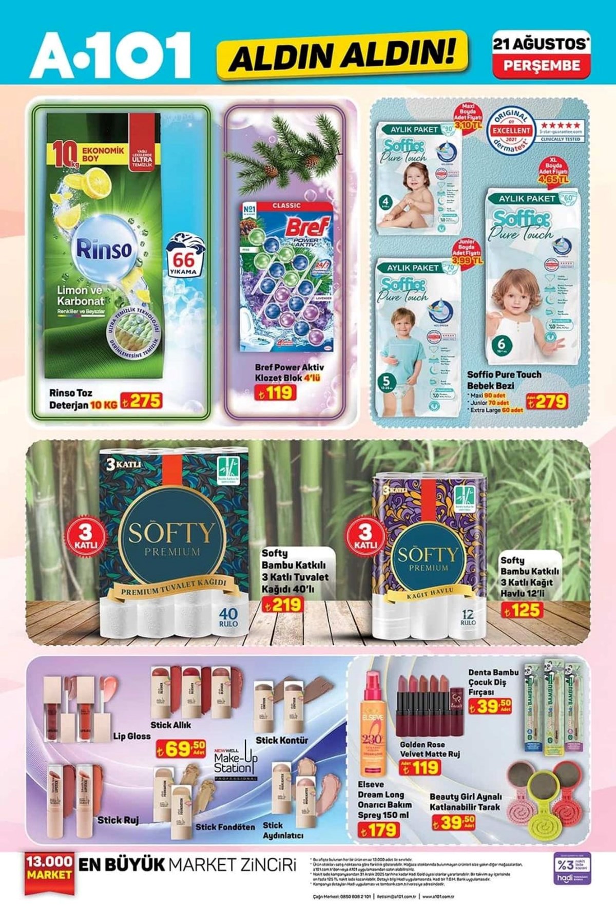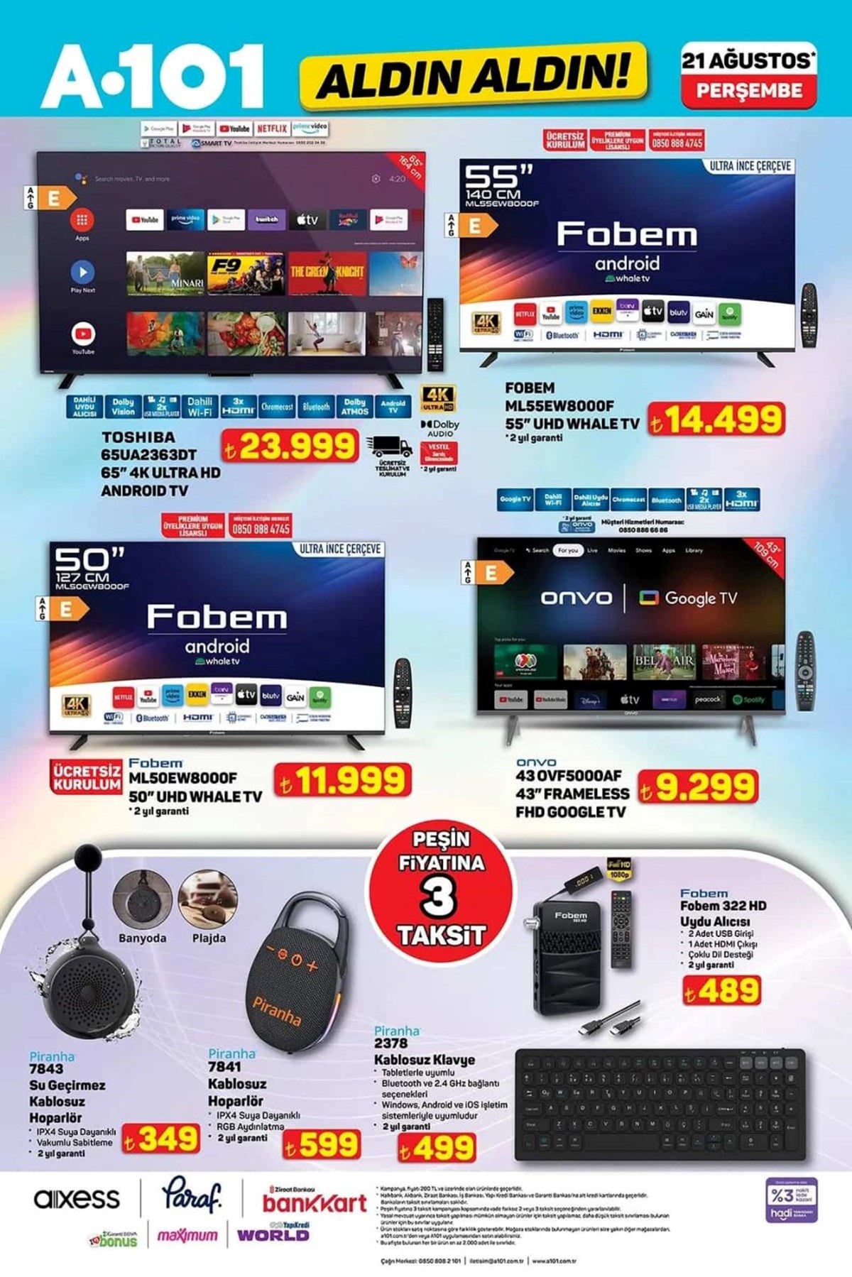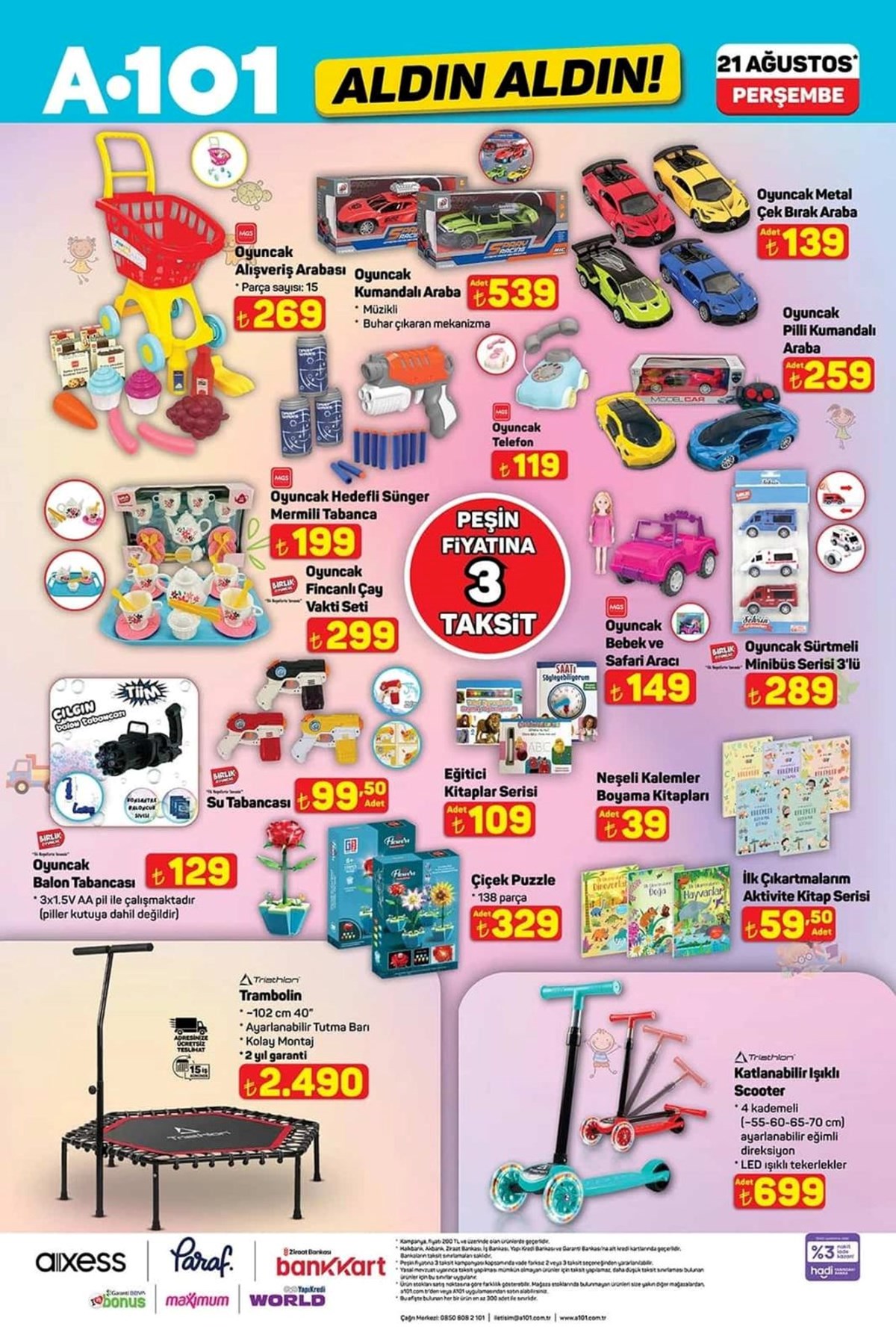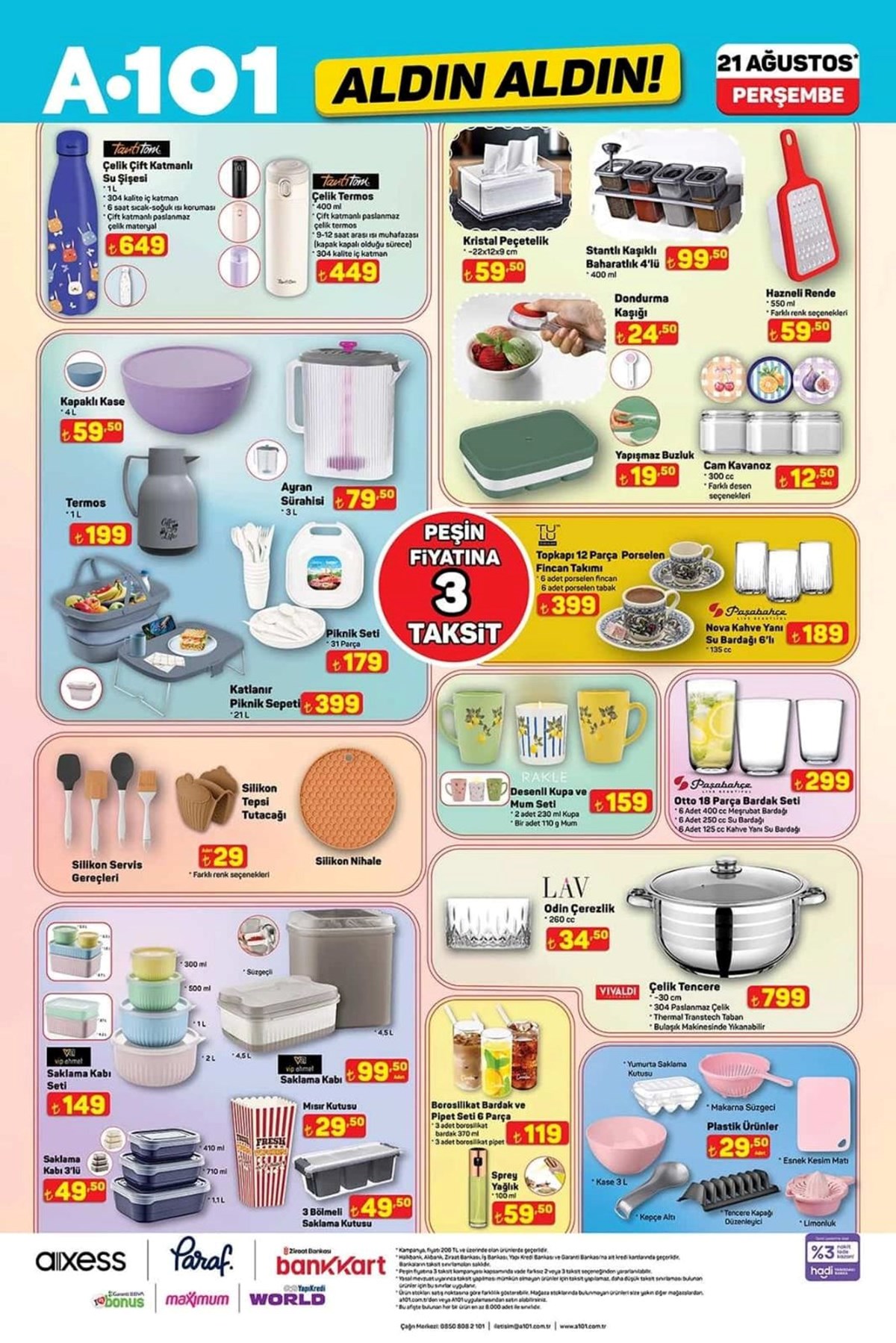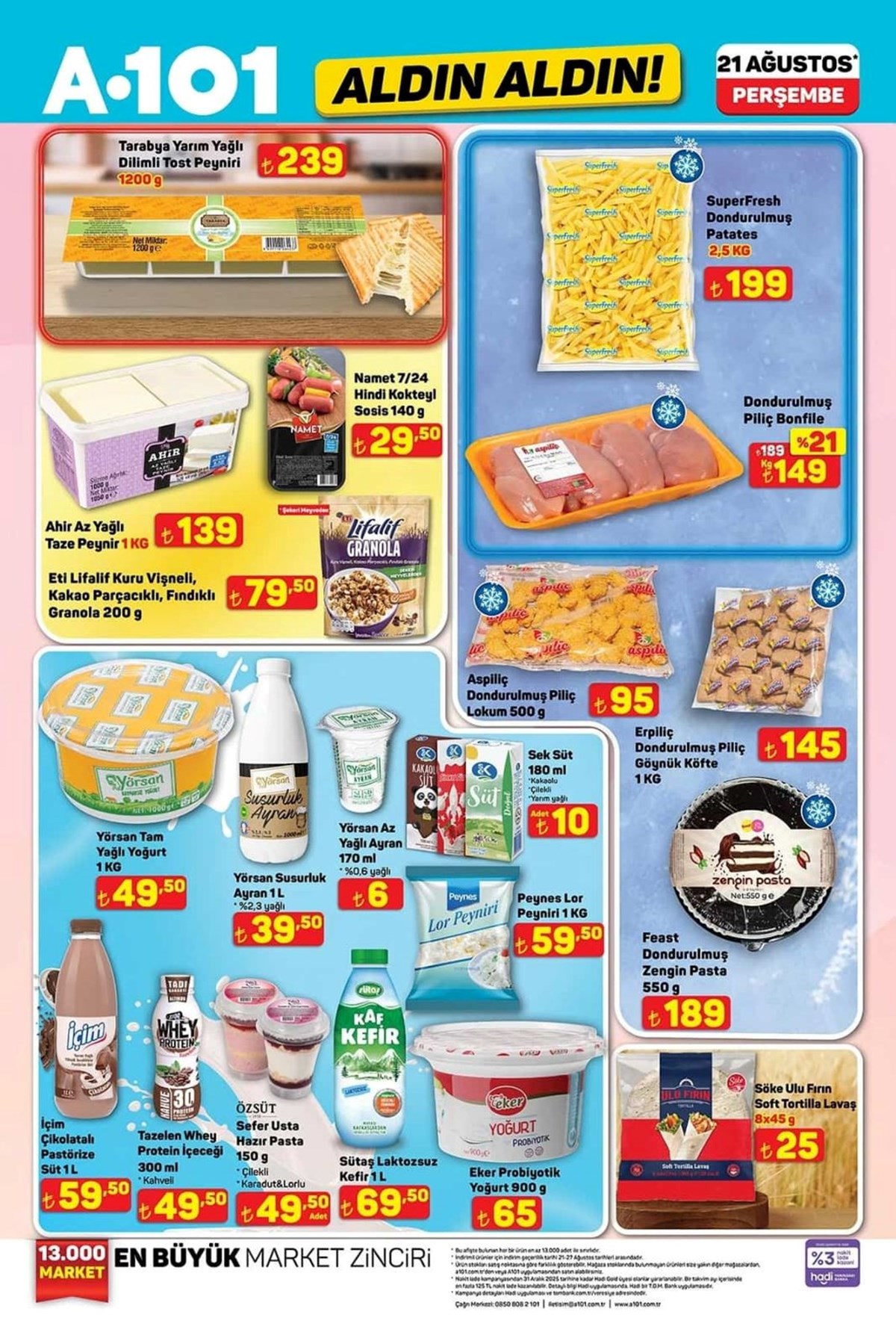 A101 21 Ağustos aktüel kataloğu ve fiyat listesi yayımlandı. A101’de haftanın kampanyalı ürünleri arasında beyaz eşyadan, televizyona, dizüstü bilgisayardan, elektronik saç şekillendirici ürünler yer aldı. Katlanabilir kamp sandalyesi 1.299 TL, 427 litre hacimli buzdolabı 18.999 TL, makyaj çantası 325 TL olurken valiz çeşitleri ise 689 TL ile 879 TL arasında değişecek. A101’de haftanın dikkat çeken ürünleri arasında ise 2.490 TL fiyat etiketiyle Trambolin yer aldı. İşte, A101 aktüel kataloğu ve fiyat listesi…A101’de yepyeni indirimler müşterilere özel fiyatlarla reyonlarda yerini almaya hazırlanıyor. Buzdolabı, çamaşır makinesi, cam su ısıtıcı, elektrikli süpürge, overlok makinesi, ışıklı fanlı ayna, halı yıkama makinesi, üç tekerlekli moped, darbeli matkap gibi ürünler A101 kataloğunda yerini aldı. A101’de bu hafta Darbeli matkap 799 TL, Lazerli termometre 479 TL, Tilki kuyruğu testere 1.649 TL, 500 ml Termos 529 TL, Katlanır Piknik Sepeti 399 TL, Kabin boy valiz 689 TL olacak.Buzdolabı – 18.999,00 TL 10 KG Çamaşır Makinesi – 14.599,00 TL 7 KG Çamaşır Makinesi – 9.999,00 TL Çıkarılabilir Plakalı Tost Makinesi – 1.799,00 TL Cam Su Isıtıcı – 599,00 TL Torbasız Cyclonic Elektrikli Süpürge – 2.799,00 TL Saç Kırık Alma Makinesi – 699,00 TL Overlok Makinesi – 7.999,00 TL LED Işıklı Fanlı Ayna – 599,00 TLBukle Maşası – 399,00 TLKoltuk ve Halı Yıkama Makinesi – 3.499,00 TLŞarjlı Islak Kuru Süpürge ve Zemin Temizleyici – 5.999,00 TL125 CC Maxi Scooter – 49.990,00 TLÜç Tekerlekli Elektrikli Moped – 45.990,00 TLOyuncak Alışveriş Arabası – 269,00 TLOyuncak Kumandalı Araba – 539,00 TLOyuncak Metal Çek Bırak Araba – 139,00 TLOyuncak Pilli Kumandalı Araba – 259,00 TLOyuncak Fişekli Çay Takti Seti – 299,00 TLOyuncak Hedefli Sünger Mermili Tabanca – 199,00 TLOyuncak Telefon – 119,00 TLOyuncak Bebek ve Safari Aracı – 149,00 TLOyuncak Sürtmeli Minibüs Serisi 3'lü – 289,00 TLSu Tabancası – 99,50 TLEğitici Kitaplar Serisi – 109,00 TLNeşeli Kalemler Boyama Kitapları – 39,00 TLOyuncak Balon Tabancası – 129,00 TLÇiçek Puzzle 138 Parça – 329,00 TLİlk Çıkartmalarım Aktivite Kitap Serisi – 59,50 TLTrambolin – 2.490,00 TLKatlanabilir Işıklı Scooter – 699,00 TL12 V Akülü Vidalama Seti – 869,00 TLAvuç Taşlama – 799,00 TL110 Parça Hobi Seti – 949,00 TLDarbeli Matkap – 799,00 TLLazerli Termometre – 479,00 TLŞarjlı Vidalama Aleti – 1.699,00 TLTilki Kuyruğu Testere – 1.649,00 TLDekupaj Testere – 799,00 TLLüks Katlanabilir Kamp Sandalyesi – 1.299,00 TLPaslanmaz Bardaklı Çelik Termos 500 ml – 529,00 TLDesenli Katlanabilir Kamp Sandalyesi – 299,00 TLKatlanabilir Kamp Sandalyesi – 279,00 TLKatlanabilir Küçük Kamp Sandalyesi – 279,00 TLÇelik Çift Katmanlı Su Şişesi 1lt – 649,00 TLÇelik Termos 400 ml – 449,00 TLKristal Peçetelik – 59,50 TLStantlı Kaşıklı Baharatlık 4'lü – 99,50 TLHazneli Rende – 59,50 TLDondurma Kaşığı – 24,50 TLKapaklı Kase – 59,50 TLAyran Sürahisi 3 L – 79,50 TLYapışmaz Buzluk – 19,50 TLCam Kavanoz 300cc – 12,50 TLTermos 1 L – 199,00 TLPiknik Seti 31 Parça – 179,00 TL12 Parça Porselen Fincan Takımı – 399,00 TLKahve Yanı Su Bardağı 6'lı – 189,00 TLKatlanır Piknik Sepeti – 399,00 TLSilikon Servis Gereçleri – 29,00 TLSilikon Nihale – 29,00 TLDesenli Kupa Mum Seti – 159,00 TL18 Parça Bardak Seti – 299,00 TLÇerezlik – 34,50 TLÇelik Tencere – 799,00 TLYuvarlak Saklama Kabı 3'lü – 149,00 TLSaklama Kabı 3'lü – 99,50 TLSaklama Kabı 3'lü – 49,50 TLMısır Kutusu – 29,50 TL3 Bölmeli Saklama Kutusu – 49,50 TLBardak ve Şişe Temizleyici – 119,00 TLSprey Yağlık – 59,50 TLPlastik Ürünler (Makarna Süzgeci, Kase, Kesim Matı vb.) – 29,50 TLMakyaj Çantası – 325,00 TLBüyük Boy Valiz – 879,00 TLOrta Boy Valiz – 759,00 TLKabin Boy Valiz – 689,00 TLDiş Fırçalık – 10,00 TLAsılır Sabunluk – 149,00 TLKaymaz Taban Klozet Takımı 2'li – 299,00 TLÇocuk Patik Çorap 5'li – 59,50 TLStraplez Dantel Sütyen – 149,00 TLSaçaklı Koltuk Örtüsü – 199,00 TLSaçaklı Banyo Havlu Seti – 179,00 TLAyçiçek Yağı 5 L – 369,50 TLNaturel Sızma Zeytinyağı 3 L – 645,00 TLHindi Salam 900 g – 99,50 TLÜçgen Peynir 24x12,5 g – 79,50 TLZeytinyağlı Konserve Ton Balığı – 125,00 TLTam Buğdaylı Bisküvi 3x133 g – 41,50 TLGazlı İçecek 3 L – 75,00 TLKahve 100 g – 119,00 TLYarım Yağlı Dilimli Tost Peyniri 1200 g – 239,00 TLDondurulmuş Patates 2,5 KG – 199,00 TLHindi Kokteyl Sosis 140 g – 29,50 TLDondurulmuş Piliç Bonfile – 149,00 TLAz Yağlı Taze Peynir 1 KG – 139,00 TLGranola 200 g – 79,50 TLDondurulmuş Piliç Lokum 500 g – 95,00 TLDondurulmuş Piliç Göğnük Köfte 1 KG – 145,00 TLTam Yağlı Yoğurt 1 KG – 49,50 TLAyran 1,5 L – 39,50 TLAyran 170 ml x 6 adet – 6,00 TLKakaolu Süt 180 ml – 10,00 TLLor Peyniri 1 KG – 59,50 TLDondurulmuş Zengin Pasta 550 g – 189,00 TLWhey Protein İçeceği 330 ml – 49,50 TLŞekerpare 150 g – 49,50 TLLaktosuz Kefir 1 L – 69,50 TLProbiyotik Yoğurt 900 g – 65,00 TLSoft Tortilla Lavaş 8x25 g – 25,00 TLToz Deterjan 10 Kg – 275,00 TLKlozet Blok 4'lü – 119,00 TLBebek Bezi Aylık Paket – 279,00 TLBambu Katkılı 3 Katlı Tuvalet Kağıdı 40'lı – 219,00 TLBambu Katkılı 3 Katlı Kağıt Havlu 12