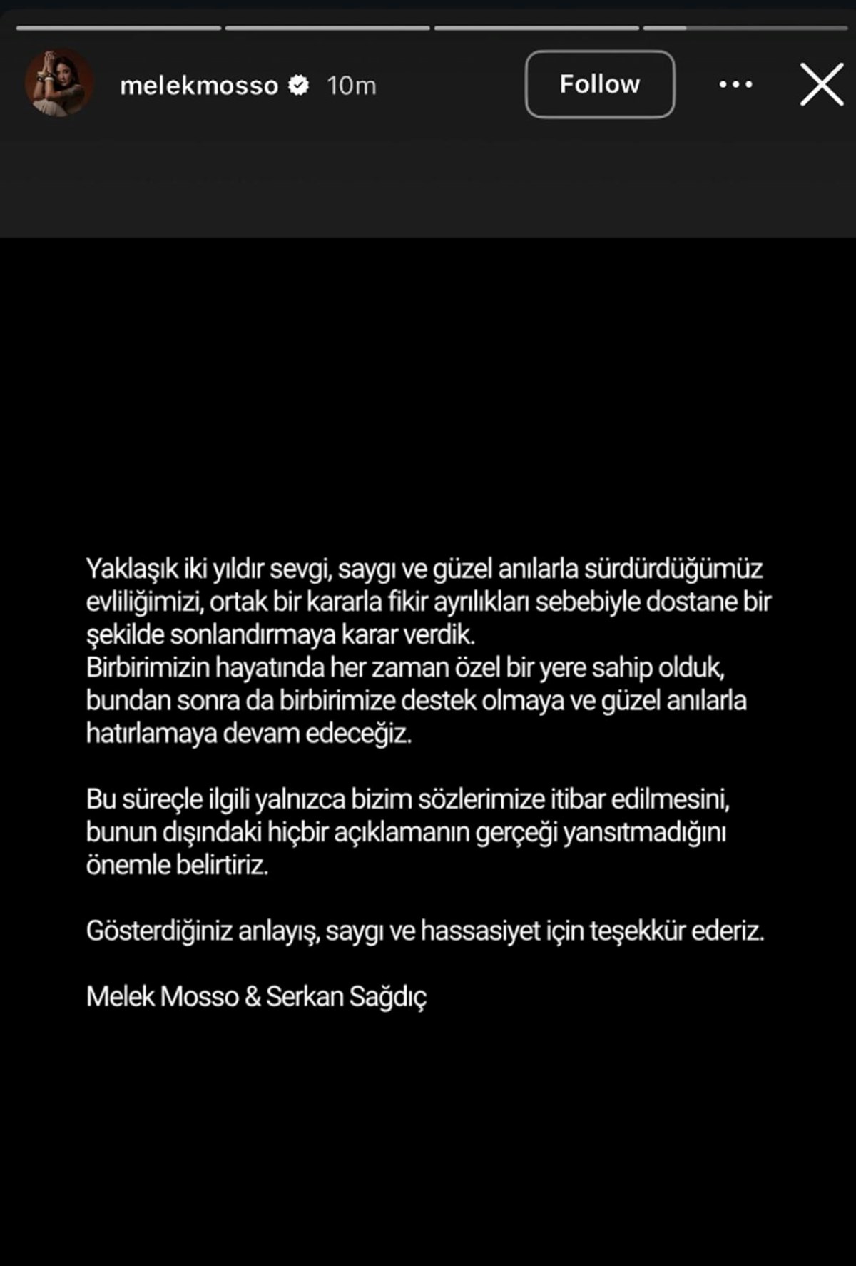 Şarkıcı Melek Mosso ile Serkan Sağdıç'ın iki yıllık evlilikleri bugün tek celsede bitti."Hayatım Kaymış", "İlletim" ve "Yeri Var" gibi şarkılarla tanınan Melek Mosso, bir süredir aşk yaşadığı Serkan Sağdıç ile 2023 yılında nikah masasına oturdu.Mersin'de dünyaevine giren ünlü çift, birkaç hafta önce ayrılık kararı aldıklarını duyurdu.Melek Mosso ile Serkan Sağdıç'ın ortak açıklamasında şu ifadeler yer aldı:"Yaklaşık iki yıldır sevgi, saygı ve güzel anılarla sürdürdüğümüz evliliğimizi, ortak bir kararla, fikir ayrılıkları sebebiyle dostane bir şekilde sonlandırmaya karar verdik. Birbirimizin hayatında her zaman özel bir yere sahip olduk."Birbirlerine her zaman destek olacaklarını söyleyen ikili, "Bu süreçle ilgili yalnızca bizim sözlerimize itibar edilmesini, bunun dışındaki hiçbir açıklamanın gerçeği yansıtmadığını önemle belirtiriz. Gösterdiğiniz anlayış, saygı ve hassasiyet için teşekkür ederiz" ifadelerini kullandı.Tüm bunların ardından Melek Mosso ile Serkan Sağdıç, evlilik birliğinin temelinden sarsılması nedeniyle anlaşmalı olarak tek celsede boşandı.İstanbul Aile Mahkemesi'nde görülen duruşmaya davacı Melek Mosso ile avukatı katılırken, davalı Serkan Sağdıç da duruşma salonunda hazır bulundu. Duruşmada hakim, taraflara "Boşanmak istiyor musunuz?" şeklinde soru sordu. Tarafların ayrı ayrı "Boşanmak istiyorum" demelerinin üzerine kararını açıklayan mahkeme, Melek Mosso ile Serkan Sağdıç'ın anlaşmalı olarak boşanmalarına hükmetti.Melek Mosso ile Serkan Sağdıç'ın mahkemeye sunduğu protokol gereği birbirinden herhangi bir tazminat, nafaka ve mal rejimine dayalı alacak talebinde bulunmadığı da öğrenildi.