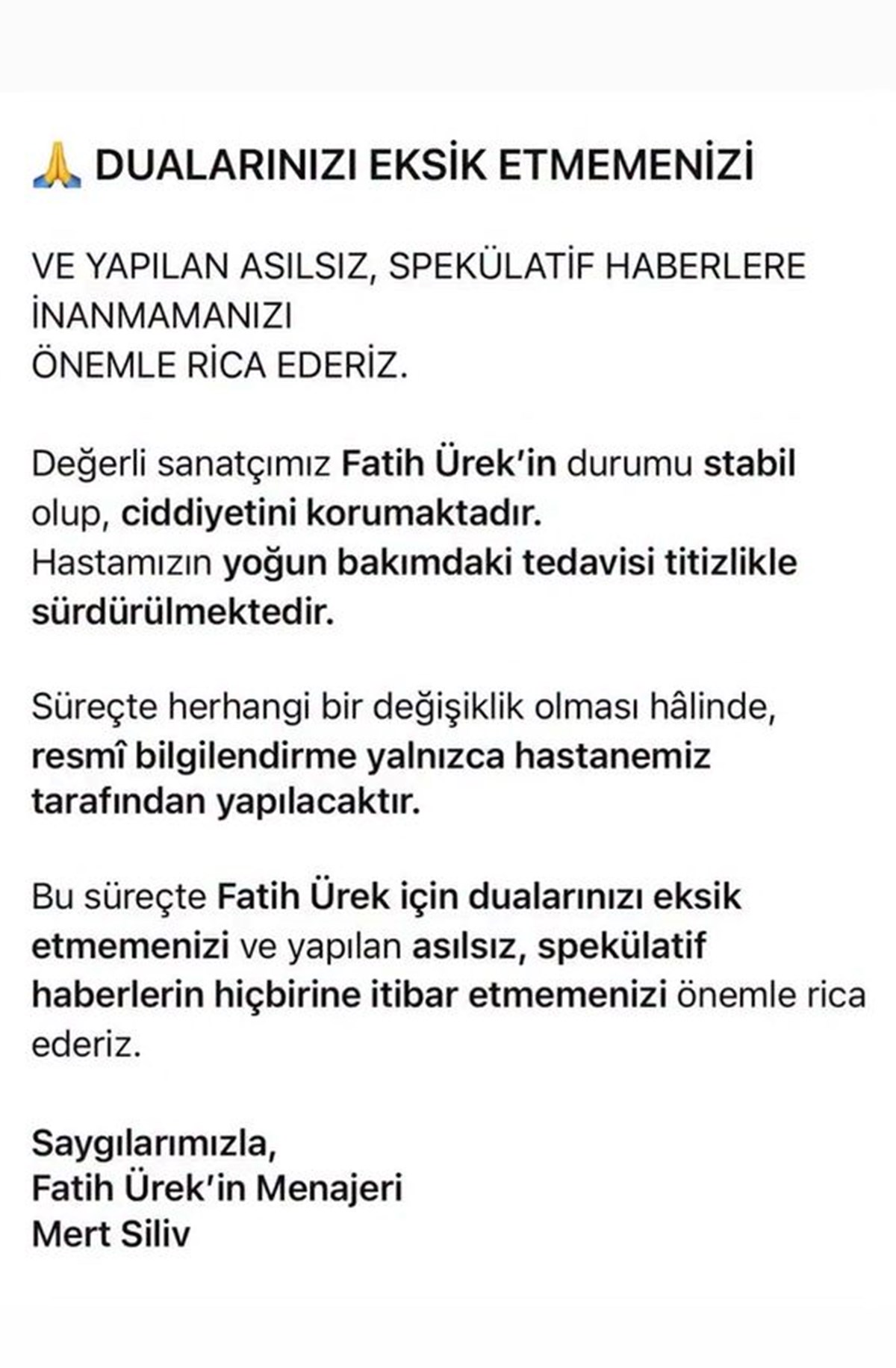 Evinde kalp krizi geçiren Fatih Ürek'in tedavisi yoğun bakımda devam ediyor. Ünlü ismin menajeri Mert Siliv'den yeni açıklama geldi.