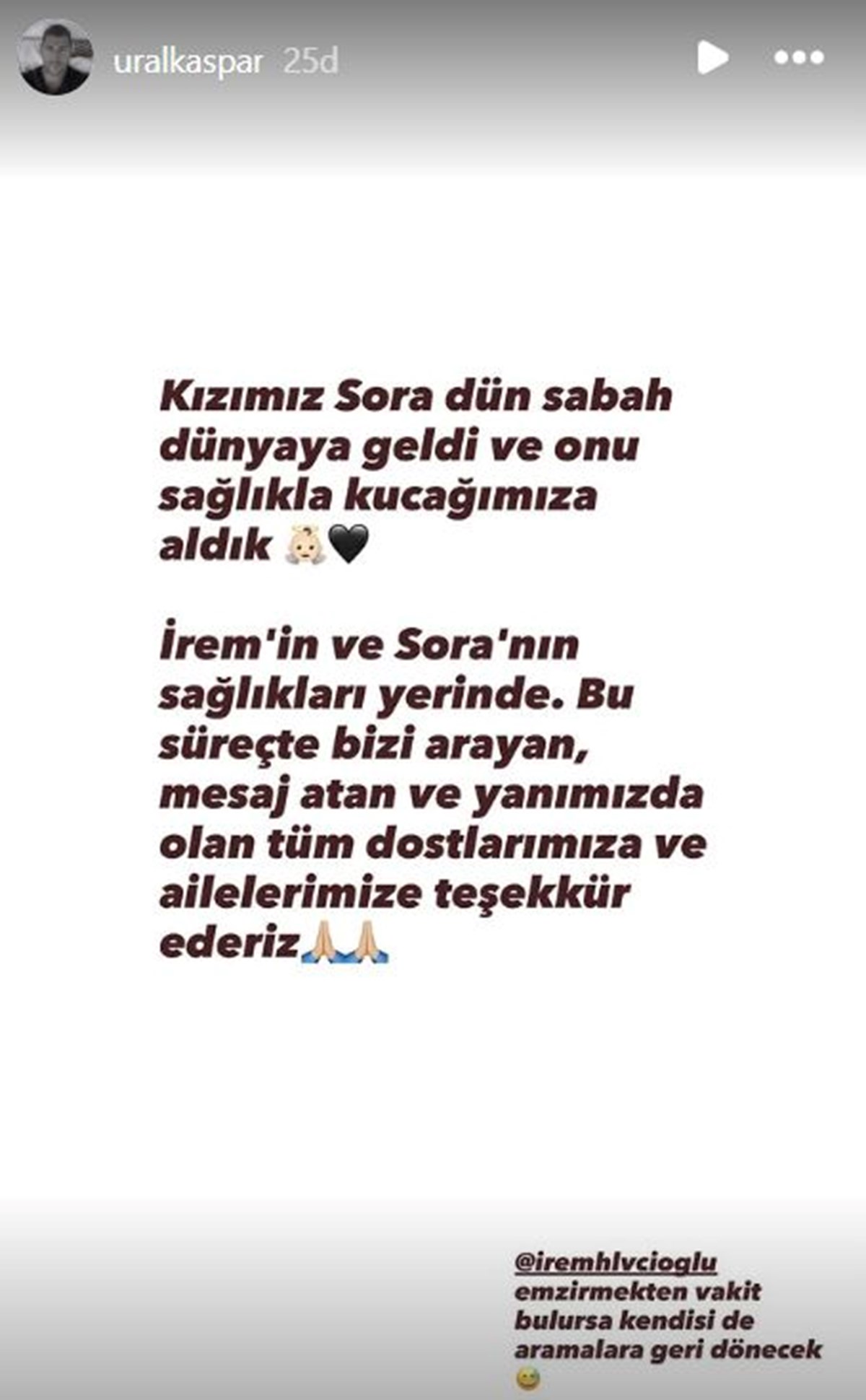 Oyuncu İrem Helvacıoğlu ile eşi Ural Kaspar, dün kızlarına kavuştu. İlk kez baba olmanın sevincini yaşayan Kaspar, bebeğin adını açıkladı.Oyuncu İrem Helvacıoğlu, Ural Kaspar ile mutlu birlikteliğini 28 Ekim 2024'te nikahla taçlandırdı.Mutluluğa "evet" diyen ünlü çiftten kısa bir süre sonra bebek müjdesi geldi.İrem Helvacıoğlu ile Ural Kaspar'dan güzel haber geldi. Ünlü çift, dün kızlarına kavuştu. Müjdeli haberi ünlü oyuncunun yakın arkadaşı Sebile Ölmez "Kızımız geldi" notuyla duyurdu.İlk kez anne baba olmanın mutluluğunu yaşayan ünlü çiftten Ural Kaspar, kızlarının adını açıkladı. Sosyal medya hesabından açıklama yapan Kaspar, "Kızımız Sora dün sabah dünyaya gekdi ve onu sağlıkla kucağımıza aldık. İrem'in ve Sora'nın sağlıkları yerinde" dedi. Ural Kaspar, aileleri ile kendilerine destek olan dostları ve yakınlarına da teşekkür etmeyi ihmal etmedi. Öte yandan Sora ismi, Japoncada gökyüzü anlamına geliyor.İrem Helvacıoğlu'ndan ilk fotoğraf da geldi. Sebile Ölmez, ünlü oyuncu ile pozunu "Küçük yaramaz bir çocuk bu" diye paylaştı.