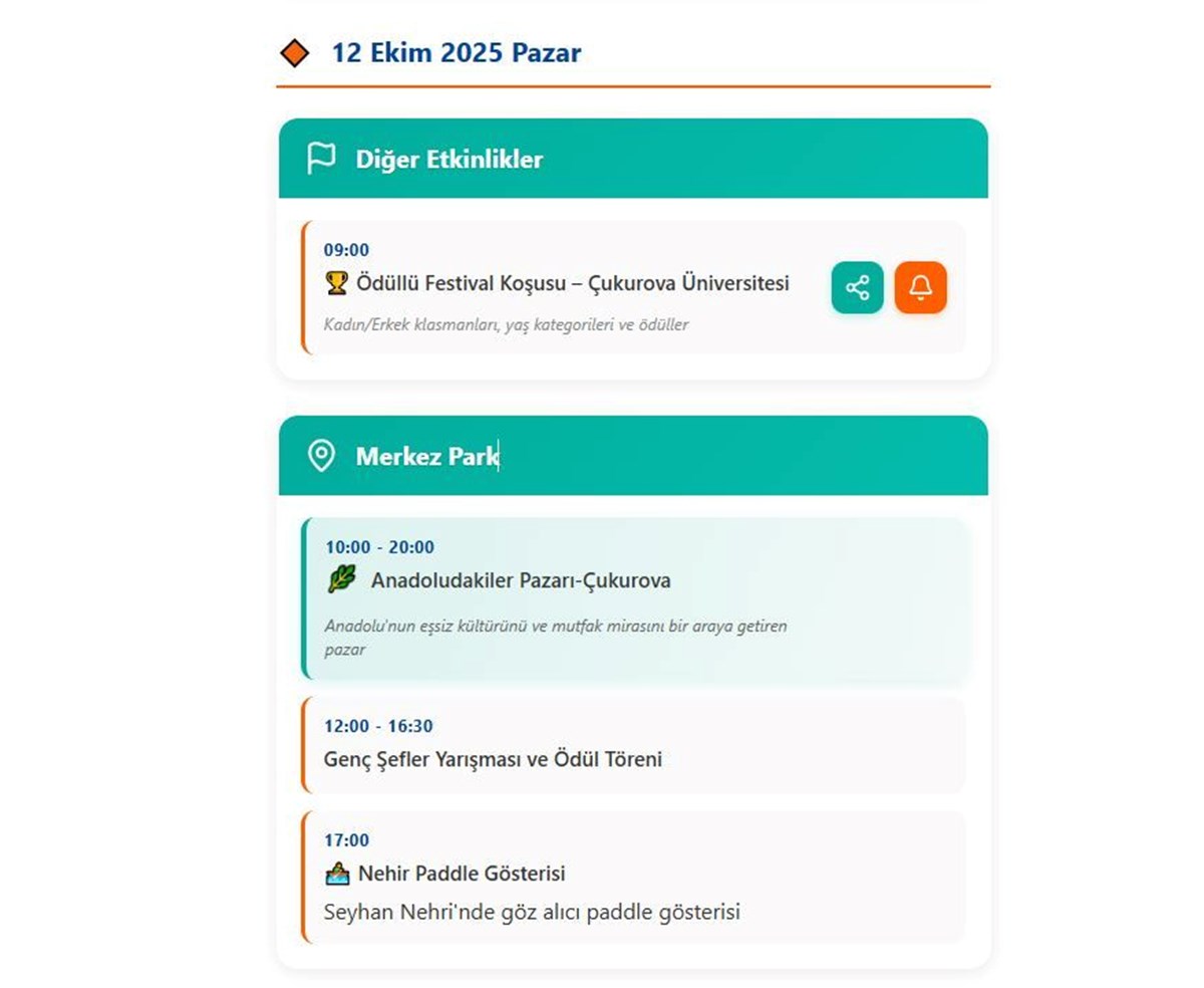Adana Valiliği’nin ev sahipliğinde bu yıl 9’uncusu düzenlenen Uluslararası Adana Lezzet Festivali, "Kuşaktan Kuşağa" temasıyla devam ediyor. Festivalin son gününe katılmak isteyenler için 12 Ekim Adana Lezzet Festivali takvimi paylaşıldı.