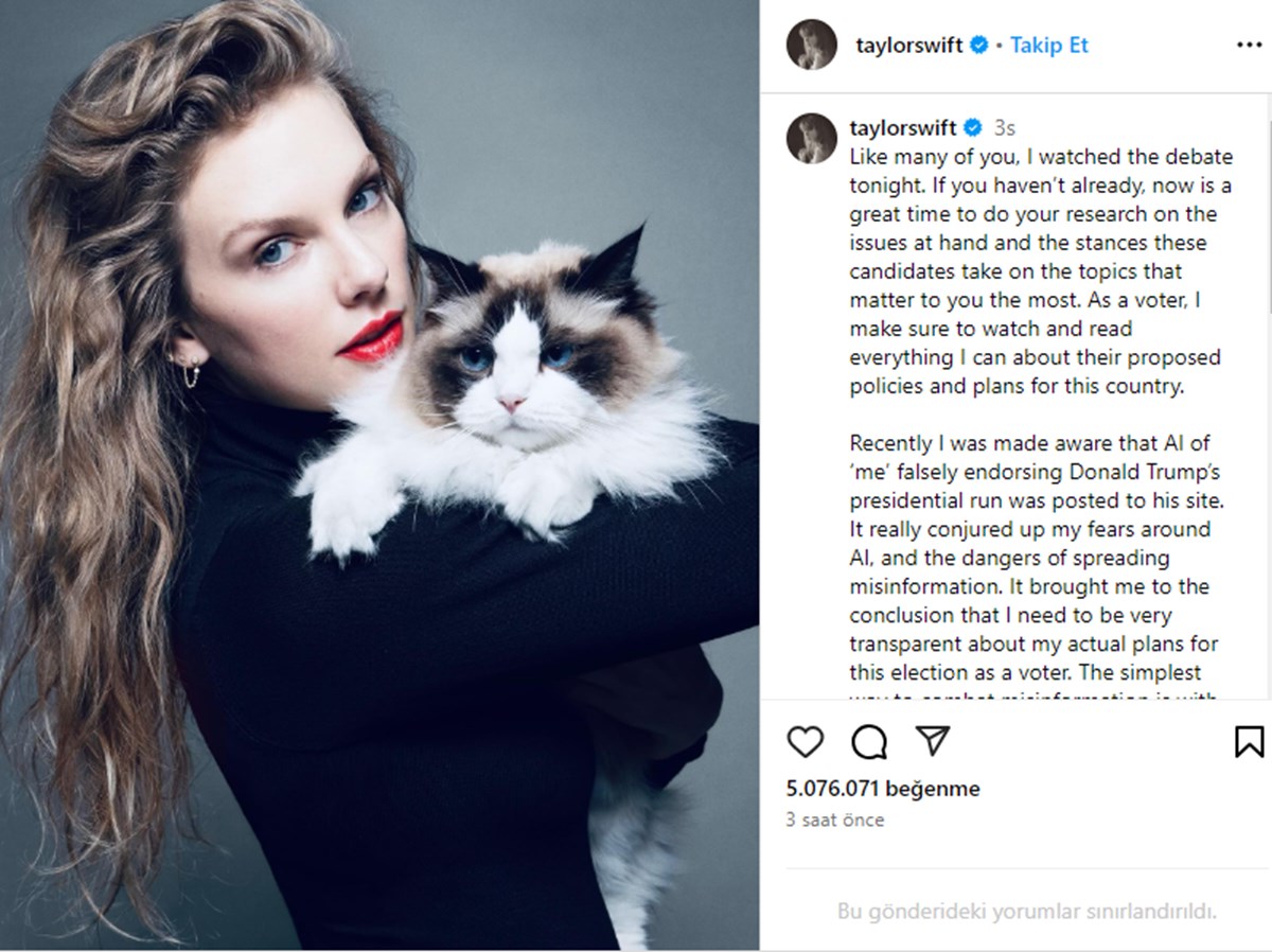 ABD'de 5 Kasım'da yapılacak başkanlık seçimleri öncesi Cumhuriyetçilerin Başkan Adayı Donald Trump ve Demokrat Aday Kamala Harris, ilk televizyon tartışmasına çıktı. Gecenin en dikkat çeken olaylarından biri de bugüne kadar seçimler hakkında konuşmayan ünlü şarkıcı Taylor Swift'in Instagram'da paylaştığı gönderi oldu. Tartışmanın bitmesinden dakikalar sonra ünlü şarkıcı "Yanlış bilgiyle mücadele etmenin en basit yolu gerçekledir" diyerek Kamala Harris'e desteğini duyurdu. Başkan adayı Trump'tan yanıt gecikmedi, Swift'in bunun "bedelini ödeyeceğini" söyledi.ABD'li, ünlü şarkıcı Taylor Swift, ABD başkanlık yarışı tartışmasından hemen sonra sosyal medya hesabından bir gönderi paylaştı. "Çocuksuz kedi hanım" imzalı yazıda Kamala Harris'i cumhurbaşkanı olarak desteklediğini açıkladı.Başkan adayları Kamala Harris ve Donald Trump'ın münazarasının sona ermesinden dakikalar sonra Instagram'da paylaştığı gönderide Swift, "Yanlış bilgiyle mücadele etmenin en basit yolu gerçekledir" dedi.Şarkıcı, Demokrat aday Kamala Harris'in inandığı haklar ve davalar için savaşacak "savaşçı" olacağını söyleyerek, Kamala Harris'i cumhurbaşkanı olarak destekledi . Bu güne kadar seçimler hakkında yorum yapmayan Swift, 283 milyon takipçili insatagram hesabındaki gönderisinde "Bir seçmen olarak, izleyebildiğim ve okuyabildiğim her şeyi izliyorum" dedi ve ekledi: "2024 başkanlık seçimlerinde oyumu Kamala Harris ve Tim Walz'a vereceğim".Swift, "Bu ülkede kaosla değil sükunetle yönetilirsek çok daha fazlasını başarabileceğimize inanıyorum." ifadesini kullandı. Swift, açıklamasında hayranlarını oy kullanmaya çağırdı.Trump, sanatçının yapay zekayla oluşturulmuş fotoğrafını paylaşarak desteğini aldığını öne sürmesinin ardından Harris'i desteklediğini kamuoyuyla paylaşma kararı aldığını belirten Swift, yapay zekanın tehlikelerine işaret etti.Donald Trump’ın başkan yardımcısı adayı JD Vance 2021 yılında verdiği bir röportajda demokratları “Sefil hayatları olan bir grup çocuksuz kedi kadın” olarak tanımlamıştı. Kedisiyle çekilmiş fotoğrafını paylaşarak Harris'e desteğini duyurması Vance'İn sözlerine gönderme olarak yorumlandı.ABD'de etkili bir figür olarak görülen şarkıcı ile ilgili Ekim 2023'te yapılan bir ankette demokratların yüzde 68'i de dahil olmak üzere genel olarak seçmenlerin yüzde 55'inin Swift hakkında olumlu bir görüşe sahip olduğu belirlendi. Virginia Tech'te halkla ilişkiler profesörü olan Cayce Myers, Swift'in desteğinin seçimlerde etkili olabileceğini, Z kuşağı hayranlarını oy vermeye teşvik edebileceğini söyledi.Myers, ünlülerin desteğinin anlamlı bir katılım anlamına gelmediğini belirtirken, Swift'in desteğinin özellikle geniş bir hayran kitlesine gittiğini ve Demokratları kayıran bir konu olan kadın haklarına odaklandığını söyledi.Trump, münazaranın ardınan "şimdiye kadarki en iyi" tartışması olduğunu ve "çok büyük" farkla kazandığını söyledi. Rakibini desteklediği için Taylor Swift'e yüklenen eski başkan Taylor Swift'in bunun bedelini "ödeyeceğini" iddia etti.