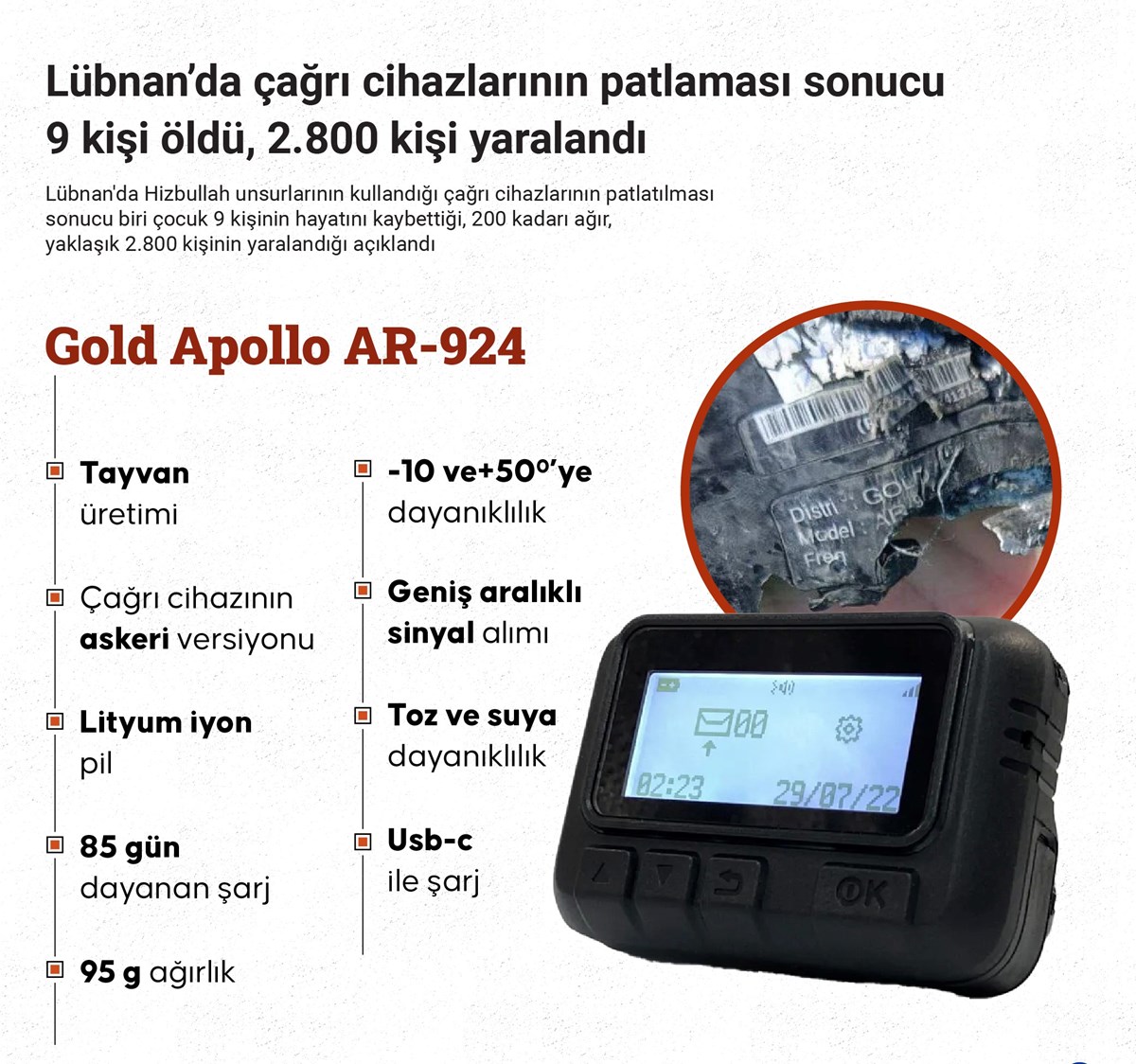 İsrail, gönderdiği sinyallerle Hizbullah'ın iletişim için kullandığı çağrı cihazlarını patlattı. 9 kişi öldü, 200'ü ağır olmak üzere 2 bin 750 kişi yaralandı. Bir Hizbullah yetkilisi, saldırının İsrail'in örgüte karşı yaptığı “en büyük güvenlik ihlali” olduğunu söyledi. İran'ın Lübnan büyükelçisinin de cihaz patlamasında yaralandığı bildirildi. Lübnan Sağlık Bakanlığı, tüm sağlık çalışanlarını işe çağırdı, vatandaşlara kan bağışı çağrısı yaptı.