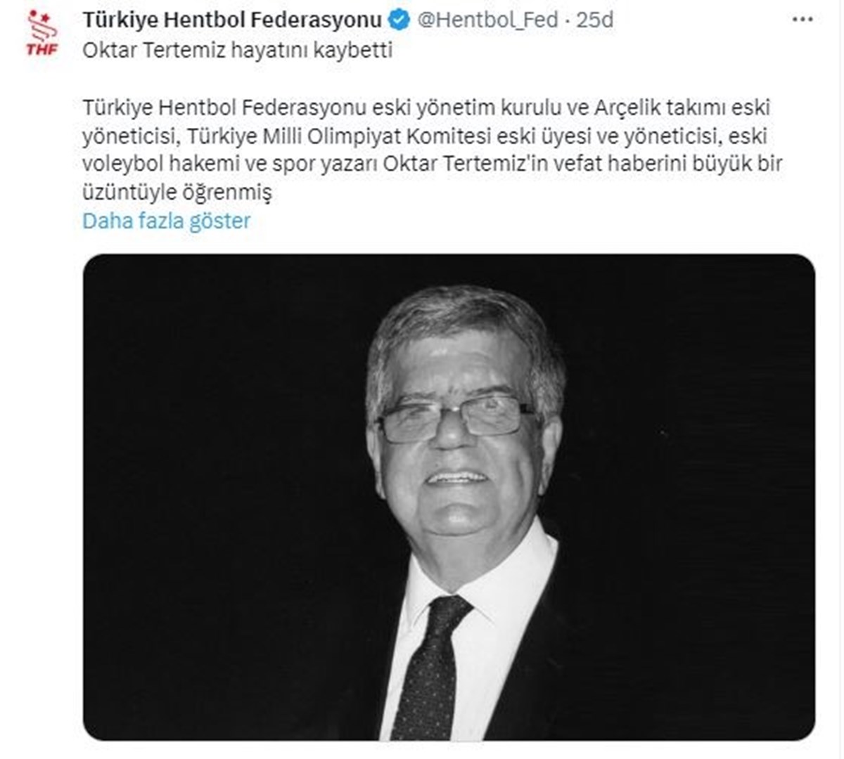 Türkiye Hentbol Federasyonu eski yönetim kurulu ve Arçelik takımı eski yöneticisi, Türkiye Milli Olimpiyat Komitesi eski üyesi ve yöneticisi, eski voleybol hakemi ve spor yazarı Oktar Tertemiz hayatını kaybetti. Oktar Tertemiz'in vefat haberini Türkiye Hentbol Federasyonu duyurdu.Türkiye Hentbol Federasyonu tarafından yapılan duyuruda; "Türk sporuna voleybolcu, hakem, yönetici, yazar olarak uzun yıllar hizmet veren, Türkiye Milli Olimpiyat Komitesi ve Türkiye Voleybol Federasyonu Yönetim Kurullarında Üye olarak görev alan ve Türk Spor Vakfı Başkanlığı yapan, değerli çalışma arkadaşımız, dostumuz ve büyüğümüz, Oktar Tertemiz’in vefat haberini derin bir üzüntüyle öğrenmiş bulunuyoruz. Yarın (20.09.2024, Cuma) öğle namazına müteakip Karacaahmet Şakirin Camii’nde kılınacak cenaze namazı sonrası Karacaahmet Mezarlığı’na defnedilecek olan Merhuma Allah’tan rahmet, ailesi ve tüm sevenlerine başsağlığı dileriz." denildi.