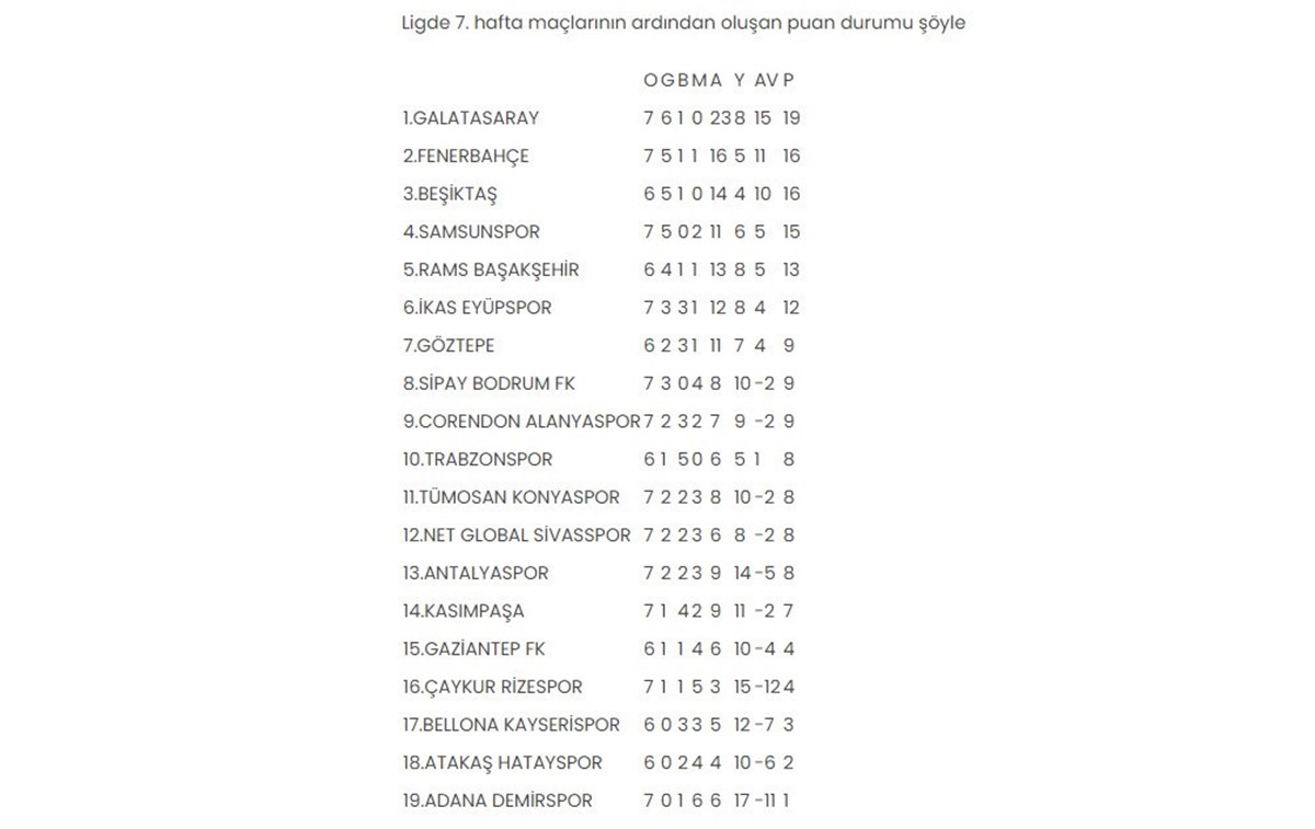 Trendyol Süper Lig'de 7. hafta maçları tamamlandı.Haftanın kapanış mücadelesinde Beşiktaş, Bellona Kayserispor'u 3-0 yendi.Kasımpaşa ile 3-3 berabere kalan Galatasaray, sezonun ilk puan kaybını yaşasa da haftayı 19 puanla liderlik koltuğunda kapattı. Ligde bu hafta oynanan karşılaşmaların 5'ini ev sahibi takımlar, 3'ünü de konuk ekipler kazandı. Bir mücadele ise beraberlikle sonuçlandı. Süper Lig'in 7. haftasında oynanan maçlarda 36 gol atıldı. 7. HAFTA SONUÇLARI Trendyol Süper Lig'in 7. haftasında oynanan karşılaşmalarda alınan sonuçlar şöyle: Net Global Sivasspor-RAMS Başakşehir: 1-2 Samsunspor-Göztepe: 4-3 Galatasaray-Kasımpaşa: 3-3 Corendon Alanyaspor-Çaykur Rizespor: 1-0 Trabzonspor-TÜMOSAN Konyaspor: 3-2 İkas Eyüpspor-Gaziantep FK: 3-2 Antalyaspor-Fenerbahçe: 0-2 Sipay Bodrum FK-Adana Demirspor: 3-1 Bellona Kayserispor-Beşiktaş: 0-3 NOT: Atakaş Hatayspor haftayı bay geçti.8. HAFTA MAÇLARI Süper Lig'de 8. hafta maçlarının programı şöyle: 4 Ekim Cuma: 20.00 Çaykur Rizespor-Antalyaspor (Çaykur Didi) 5 Ekim Cumartesi: 13.30 Kasımpaşa-Sipay Bodrum FK (Recep Tayyip Erdoğan) 16.00 Göztepe-Net Global Sivasspor (Gürsel Aksel) 19.00 RAMS Başakşehir-Bellona Kayserispor (Başakşehir Fatih Terim) 19.00 Atakaş Hatayspor-Trabzonspor (Mersin) 6 Ekim Pazar: 13.30 TÜMOSAN Konyaspor-İkas Eyüpspor (MEDAŞ Konya Büyükşehir) 16.00 Adana Demirspor-Samsunspor (Yeni Adana) 19.00 Gaziantep FK-Beşiktaş (Kalyon) 19.00 Galatasaray-Corendon Alanyaspor (RAMS Park) NOT: Fenerbahçe haftayı bay geçecek.