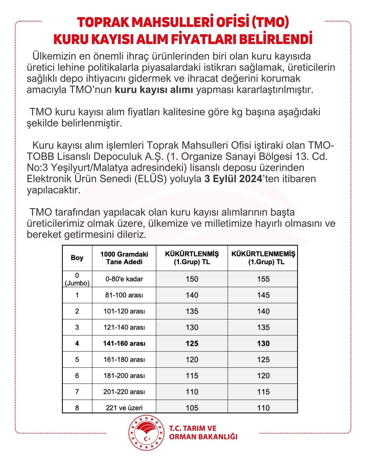 Tarım ve Orman Bakanlığı, kuru kayısı alım fiyatlarının belirlendiğini ve Toprak Mahsulleri Ofisi (TMO) tarafından 3 Eylül'den itibaren alım yapılacağını bildirdi.Tarım ve Orman Bakanlığı'nın sosyal medya platformu X'teki hesabından yapılan paylaşımda, Türkiye'nin en önemli ihraç ürünlerinden biri olan kuru kayısıda üretici lehine politikalarla piyasada istikrarı sağlamak, üreticilerin sağlıklı depo ihtiyacını gidermek ve ihracat değerini korumak amacıyla TMO'nun kuru kayısı alımı yapmasının kararlaştırıldığı belirtildi. Paylaşımda, şunlar kaydedildi: "Kuru kayısı alım işlemleri, Toprak Mahsulleri Ofisi iştiraki olan TMO-TOBB Lisanslı Depoculuk AŞ lisanslı deposu üzerinden Elektronik Ürün Senedi yoluyla 3 Eylül'den itibaren yapılacak."